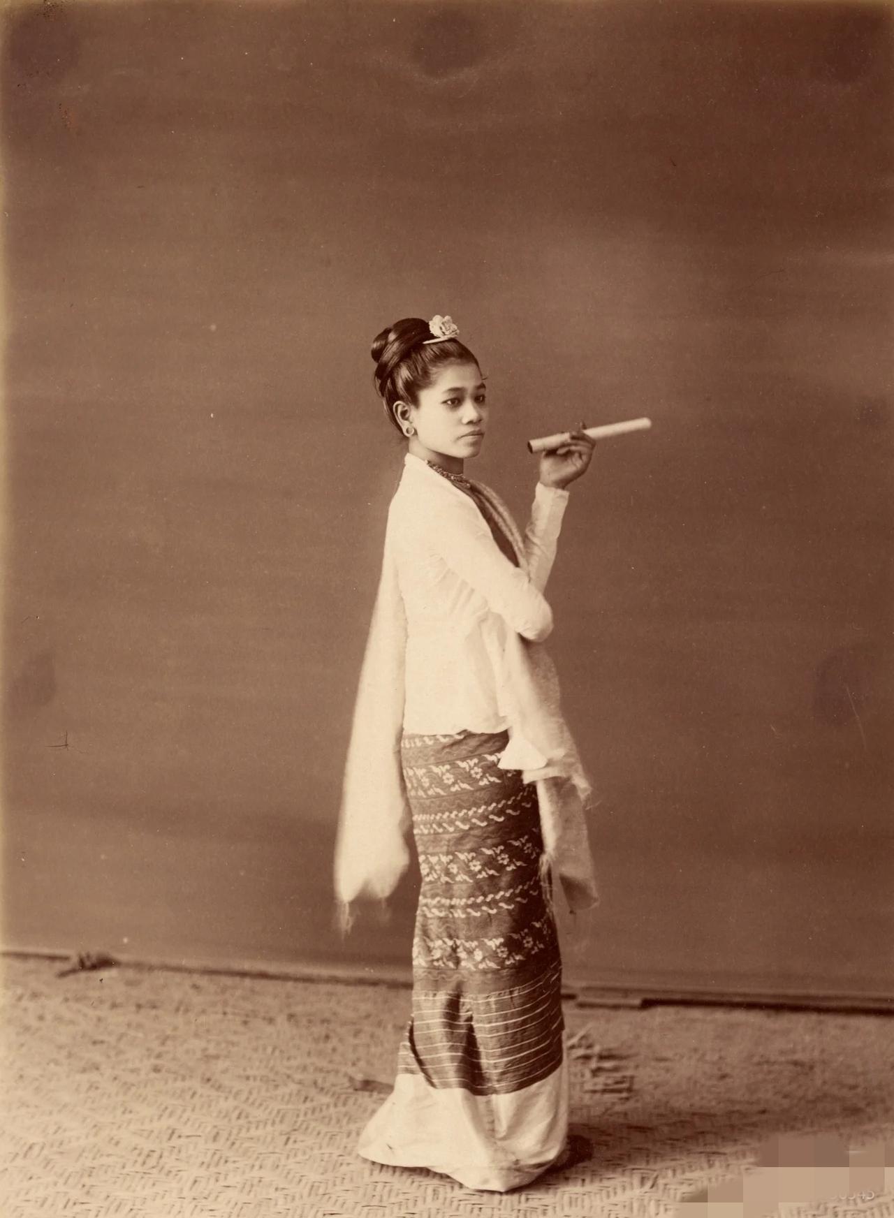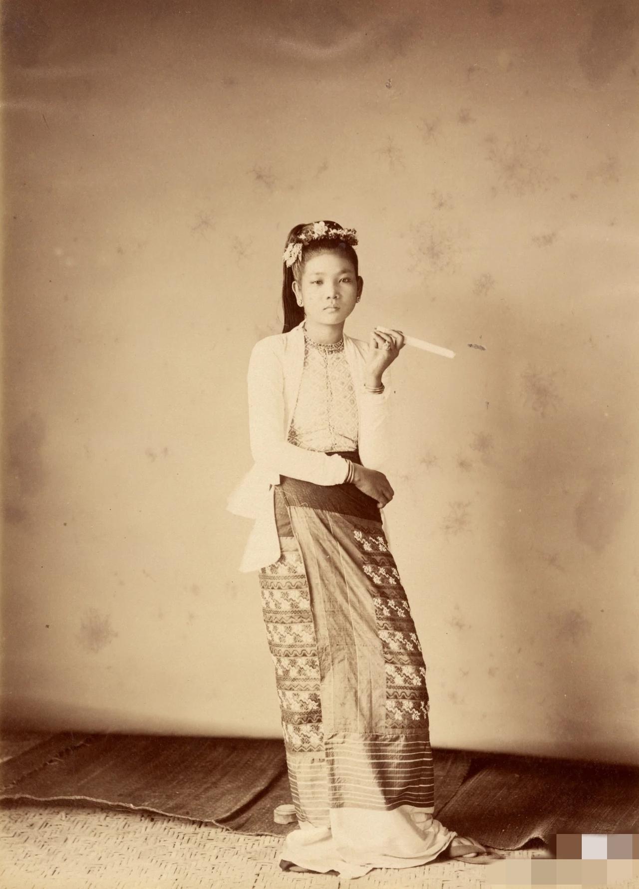 1886年,缅甸的时髦小姑娘。这一年,缅甸贡榜王朝被英国灭亡,1886年7月24日,清政府与英国在北京签订了《中英缅甸条款》。条约中,英国同意缅甸每十年向清廷进贡一次,但清廷承认了英国对缅甸的统治权。这标志着延续数百年的中缅宗藩关系正式终结,缅甸完全沦为英国殖民地。 这一时期的缅甸服装,也很有特色。贵族男性,穿着隆丝绸筒裙。贵族女性,身着如馆藏文物般华丽的多部件刺绣礼服,饰有亮片与珠宝。 而普通民众, 男性日常穿着普通的棉质筒裙和对襟短上衣。女性穿着棉或普通丝绸的筒裙与紧身上衣。