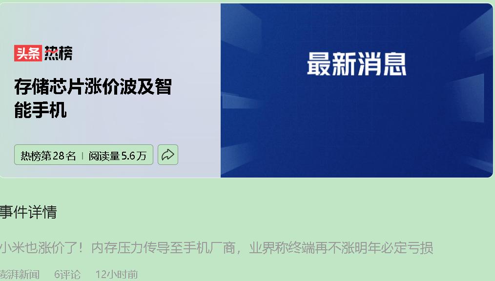 最近想换手机的兄弟,是不是发现安卓旗舰越来越贵了?小米新机直接涨五百,雷总都“交不起朋友”了。可你看苹果,稳如泰山。这事儿怪得很吧?说白了,这场存储芯片风暴,就是AI狂欢后甩给我们普通人的账单。苹果不慌,是因为它早就不靠这个赚钱了。 别扯什么周期,根本原因就一个:产能被抢了。现在AI服务器才是“吞金兽”,一台顶普通服务器八倍的需求。大厂都赶着去做更赚钱的HBM了,留给手机电脑的芯片自然少得可怜,价格坐火箭往上窜。这哪是市场波动,这就是赤裸裸的“抢粮”。 那你肯定想问:为啥就安卓阵营嗷嗷叫,苹果好像有“免疫力”? 第一,苹果利润厚,扛得住。安卓机还在血拼性价比,硬件利润薄得像纸。苹果不一样,它的毛利空间大,暂时不跟着存储涨价走,也亏得起。 第二,也是最关键的,人家卖的不是硬件,是iOS和那个标。你为系统买单,为生态买单,不是纯粹为那点内存和存储买单。所以存储成本涨它的,苹果靠别的地方早就把钱赚回来了。安卓涨的是成本价,苹果赚的是品牌税。 那安卓旗舰跟风涨价,该骂吗?我说,是无奈,但也不冤。 成本压力是真的,行业大佬都说了,再不涨价明年大家都得亏本卖。可为啥不同情?因为过去卷参数、拼低价,把路走窄了。利润压到极限,成本一涨,只能让用户接盘。回头看看华为为啥敢逆势降价?技术自主和供应链把控才是底气。涨价潮,照出的就是“内卷后遗症”。 所以说别光盯着手机贵了几百块。这事告诉我们:总跟在别人后面卷,命脉就永远在别人手里。 存储涨价可能还得持续一两年,作为用户,不是刚需就忍忍,老款清仓时更香。也别盲目追顶配,问问自己:我真用得完吗? 这场风波也是个提醒:能活下来的品牌,最终得靠技术、体验,而不是价格战。希望这几百块“学费”,能真的换来点成长吧。存储芯片涨价波及智能手机小米新机涨价 华为旗舰新机逆市降价