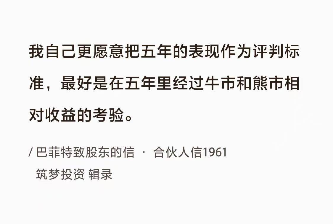 巴菲特曰:“我自己更愿意把五年的表现作为评判标准,最好是在五年里经过牛市和熊市相对收益的考验。”