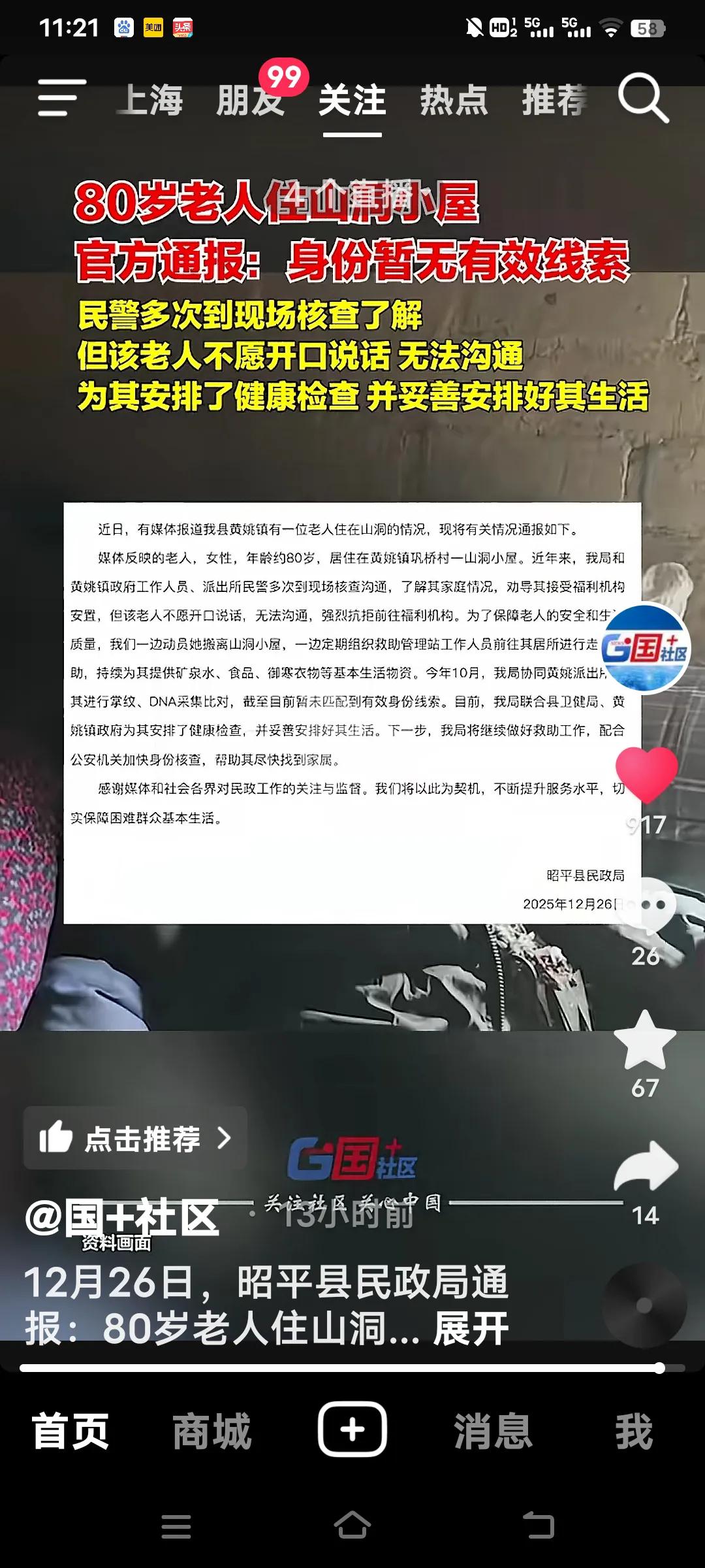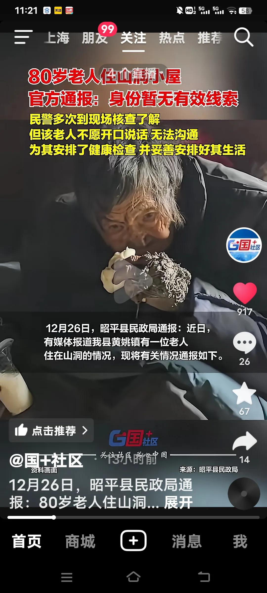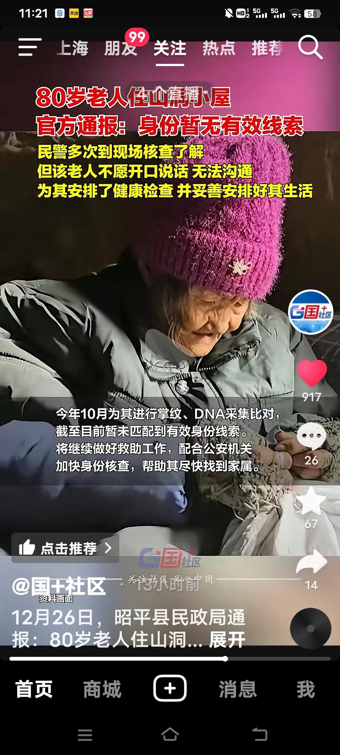 近日,广西贺州市昭平县一位80岁老人独居山洞一事引发社会关注。 12月26日,民政局发布通报,原来这位老人是女性,居住在黄姚镇巩桥村的山洞小屋内。多年来,民政局、镇政府、派出所工作人员多次与她沟通,想将她安置到福利机构,但她沉默不语且十分抗拒。工作人员只好定期为她送去生活物资。今年10月,工作人员采集了她的掌纹和DNA,截至目前仍未匹配到有效身份线索。 看罢此事,着实令人心生怜悯。这或许表明她并非本地人,否则怎会无人认识她呢?究竟是什么缘由让她栖身山洞呢?真心希望能早日帮她寻得家人,圆她团圆之梦! 独守老人生活 山里老人的现状