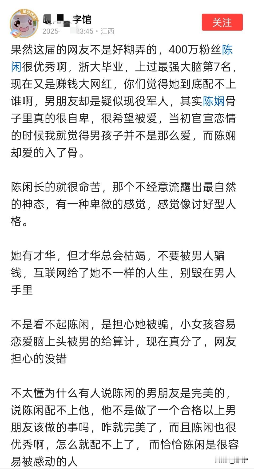 看到一位江西小仙女写的陈娴分手, 真的有点让人气愤, 把人家名字都写错了, 不得不承认陈娴确实很优秀, 浙江大学学霸, 还上过最强大脑, 节目效果很突出, 毕业后直接去做了网红, 如今粉丝量也很庞大, 找了一个军人男友, 两人恋爱8个月, 期间见过几次父母, 看得出来双方都很认真, 到了小仙女这里, 满满的对于男方的敌视, 刻意突出男方军人的身份, 更要借助舆论的力量谴责男方, 一看男方就是个老实孩子, 而且非常的认真对待这份感情, 并不是他说的玩玩的类型, 两个人热恋8个月, 最后是和平分手, 这就说明了一切, 一个是网红界的人, 一个是保家卫国的人, 双方本不在一个世界维度, 只是机缘巧合之下走在了一起, 感情这个事谁说的准? 不合适了分开才是对双方最好的安排, 没必要闹来闹去, 该小仙女还特意挑了几位典型女生的发言,似乎要证明什么, 军人的荣誉不容侮辱, 大家对于该女生写这样的小作文怎么做? 你知道的大网红都有谁 学霸那些事儿 陈闲