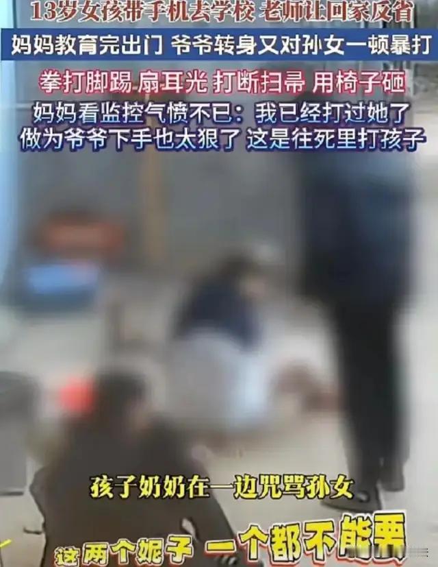 河南,有个13岁的女孩,她把手机带去了学校,结果被老师发现后告知了家长。妈妈回家后,对女孩进行了批评教育,随后便出门去了。谁能想到,爷爷却借着这个由头,对孙女大打出手,先是狠狠地踹了女孩,接着拿起扫帚猛抽,几下就把扫帚抽断了。这还不算完,爷爷又抡起椅子砸向女孩,椅子都被砸烂了。另一个孙女见状过来阻拦,也被爷爷打倒在地。而奶奶不仅没有上前劝阻,还在一旁说风凉话。妈妈回家看到女儿满身伤痕,调取监控后心疼得不行。 13岁的女孩,就像很多同龄孩子一样,对新鲜事物充满好奇,手机便是其中之一。 有一天,女孩没忍住,把手机带去了学校。学校有规定,学生不能带手机进校园,所以老师发现后,第一时间就联系了女孩的妈妈。 妈妈接到老师的电话后,心里又着急又生气。她匆匆赶回家,看到女儿低着头站在那里,心里虽然心疼,但还是强忍着怒火,严肃地对女儿进行了批评教育。 她告诉女儿,带手机去学校是违反规定的,这样做不仅会影响自己的学习,还会给班级带来不好的影响。 女孩听了妈妈的话,低着头,眼泪在眼眶里打转,她知道自己错了,乖乖地听着妈妈的教诲。妈妈教育完后,想着女儿能好好反思,便出门去办点事儿。 妈妈刚出门没多久,家里就炸开了锅。爷爷不知道从哪得到了消息,怒气冲冲地冲到女孩面前。他二话不说,抬起脚就狠狠地踹向女孩的屁股,女孩被这突如其来的一脚踹得一个踉跄,差点摔倒。 她惊恐地看着爷爷,不明白爷爷为什么要这么对她。还没等她反应过来,爷爷又抄起旁边的扫帚,朝着女孩的身上猛抽下去。“啪、啪”几声,扫帚的枝条在女孩身上留下了红红的印记,没几下,扫帚就断了。 女孩疼得眼泪止不住地流,她大声地哭喊着:“爷爷,别打了,我知道错了!”可爷爷根本不听,他扔掉断了的扫帚,又抓起旁边的一把椅子,高高地举过头顶,然后狠狠地朝着女孩砸了下去。 “哐当”一声,椅子砸在女孩身上,又重重地摔在地上,变得粉碎。女孩被砸得瘫倒在地上,身体蜷缩成一团,不停地抽搐着。 这时,另一个孙女听到动静,赶紧跑过来,她看到姐姐被打成这样,心疼极了。她不顾一切地冲上去,挡在姐姐身前,大声地对爷爷说:“爷爷,别打姐姐了,她已经知道错了!” 可爷爷就像疯了一样,根本不顾这个孙女的阻拦,一把将她也推倒在地。女孩躺在地上,看着妹妹也被打倒,心里又害怕又绝望。 而奶奶呢,就站在一旁,冷冷地看着这一切。她不仅没有上前劝阻爷爷,嘴里还嘟囔着一些风凉话:“女孩家家的,就是不听话,打一顿就好了。”那冷漠的态度,仿佛被打的不是她的孙女,而是一个陌生人。 过了一会儿,妈妈办完事回来了。她一进门,就感觉家里的气氛不对劲。她四处寻找女儿的身影,终于在角落里看到了满身伤痕的女儿。 女孩的脸上青一块紫一块,身上到处都是被扫帚抽打和椅子砸伤的痕迹,衣服也被扯破了,头发凌乱地散在脸上。 妈妈看到女儿这副模样,心疼得眼泪夺眶而出。她赶紧跑过去,把女儿抱在怀里,轻声安慰着:“宝贝,别怕,妈妈回来了。” 妈妈想知道到底发生了什么事,为什么女儿会被打成这样。于是,她调取了家里的监控。当她看到监控里爷爷对女儿拳打脚踢的那一幕幕,她的心都碎了。 她无法想象,自己的女儿在短短几分钟内遭受了如此残酷的殴打。她更无法理解,爷爷为什么会这么狠心,只因为女儿带手机去学校犯了错,就要下这么重的手,而且仅仅因为女儿是女孩,就如此重男轻女。 孩子犯错,家长进行适当的批评教育是应该的,但像爷爷这样借机泄愤,对孩子实施如此残忍的暴力行为,实在是不可原谅。 重男轻女的思想更是要不得,男孩女孩都是父母的心头肉,都应该得到平等的对待和关爱。 希望这个女孩能早日走出这段阴影,重新找回生活的快乐和自信。 爷爷借着孙女带手机去学校这事,对孙女拳打脚踢,用扫帚抽、椅子砸,把孩子打得浑身是伤,这妥妥的就是家庭暴力跟虐待。 根据《反家庭暴力法》第二条,家庭暴力是指家庭成员之间以殴打、捆绑、残害、限制人身自由以及经常性谩骂、恐吓等方式实施的身体、精神等侵害行为。 爷爷这做法完全符合家庭暴力的定义,而且情节还挺恶劣的。 依据《刑法》第二百六十条,虐待家庭成员,情节恶劣的,处二年以下有期徒刑、拘役或者管制。 爷爷这么对待孙女,就得受到法律的制裁。 还有那奶奶,在一旁看着爷爷打孩子,不仅不劝阻,还说风凉话,这简直就是共犯。 她虽然没有直接动手,但她的行为助长了爷爷的暴力行为,对孩子的伤害也起到了推波助澜的作用。 女孩的妈妈,可以依据《未成年人保护法》和《刑法》,起诉爷爷,追究他的刑事责任,以此来维护孩子的合法权益,让孩子能得到应有的保护和公正的对待。
