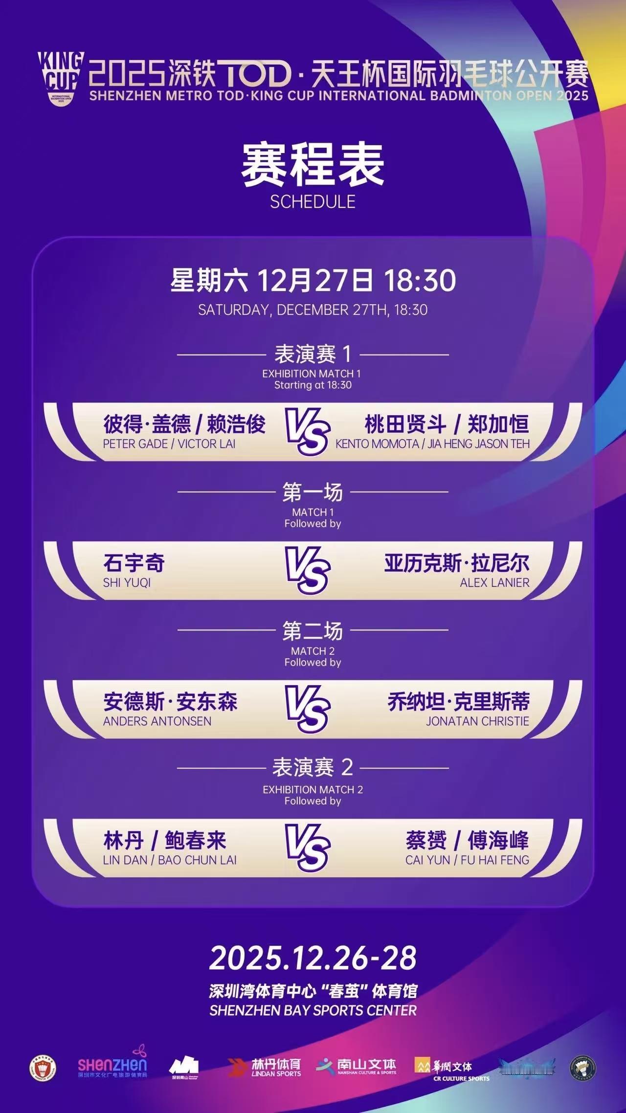大家注意看啦,福利来了,今天的天王杯半决赛,不仅有两场男单半决赛,石宇奇对阵拉尼尔、乔纳坦对阵安东森,还有两场男双表演赛,第一场是盖德/赖浩俊对阵桃田贤斗搭档郑加恒,专业男单打男双能配合默契吗?值得期待!还有一场就是天王林丹搭档鲍春来对阵曾经的世界第一国羽风云组合,退役多年的他们还能打出酣畅漓淋的对抗吗?我们拭目以待![赞][点亮平安灯]
