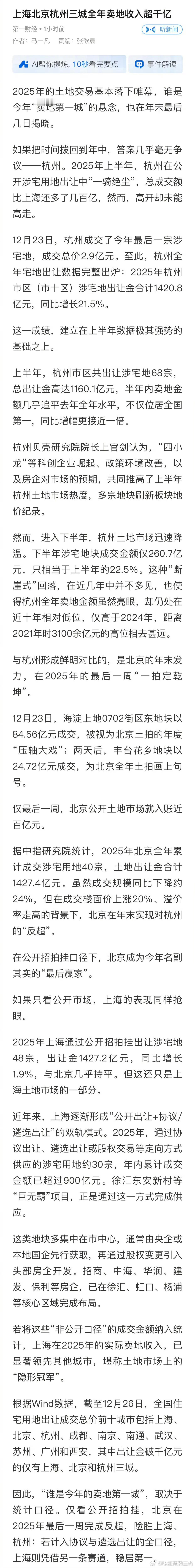 上海北京杭州全年卖地收入超千亿如果考虑单方楼面价,还有上海北京的城市、人口规模。杭州在新房供应量上,一骑绝尘。