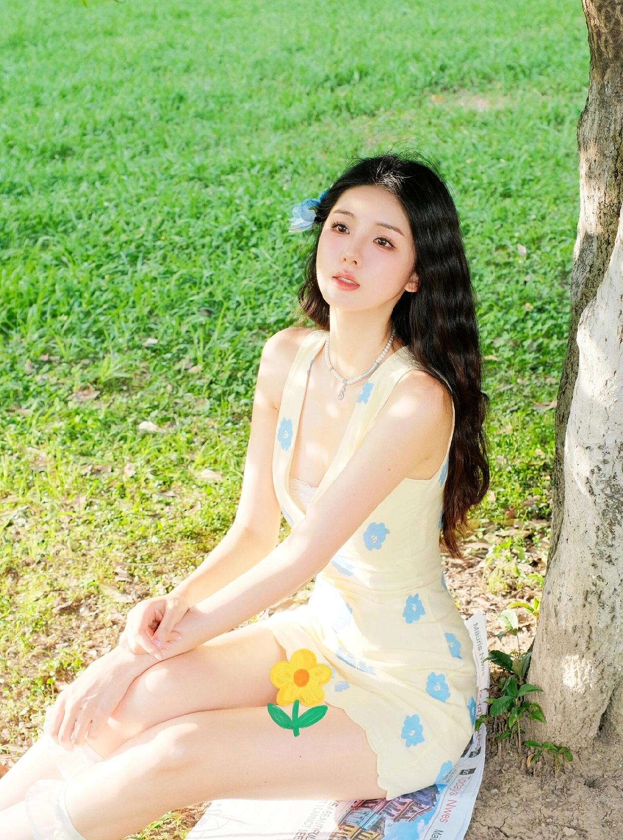《夏树黄裙》原创诗词 青芜铺地树阴稠,黄裙裁夏缀蓝柔。 发边簪得青花小,坐看流光碎影浮。 风拂袂,草凝眸,一襟清兴揽芳洲。 人间好景唯今夏,裙色轻摇占尽秋。