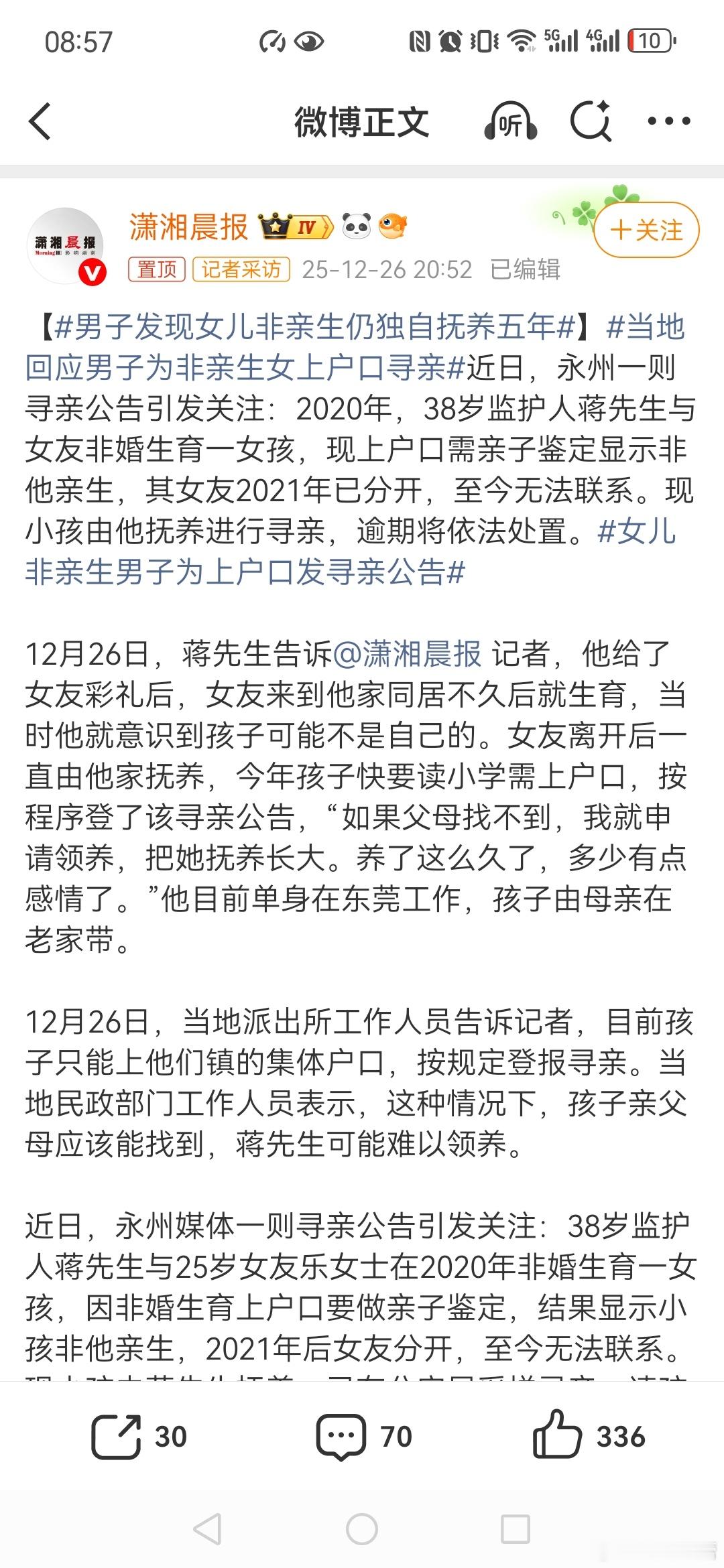 【男子发现女儿非亲生仍独自抚养五年】当地回应男子为非亲生女上户口寻亲女儿非亲生男子为上户口发寻亲公告这个父亲让人感动,明知不是自己的女儿也愿意抚养长大。男子很善良,想领养,但必须依法进行,如果实在寻找不到亲生父母,就等自己满足法律规定的收养条件再办理收养,男子与女孩年龄差距要40周岁,所以男子还需要等七八年才可以办理收养, 此事本来不该上网和上热搜,这容易让周围的人都知道孩子的隐私对孩子今后指指点点怎么办? 根据《民法典》及相关法律规定,单身男子收养女孩需满足以下条件和遵循相关规定:一、收养人条件年龄要求:收养人年满30周岁。子女数量:无子女或者只有一名子女。抚养能力:有抚养、教育和保护被收养人的能力,包括经济能力、居住条件、教育能力等,能为被收养女孩提供稳定的生活环境和成长保障。健康状况:未患有在医学上认为不应当收养子女的疾病,如精神疾病、传染性疾病等可能影响抚养能力或女孩健康的疾病。违法犯罪记录:无不利于被收养人健康成长的违法犯罪记录,如暴力犯罪、性犯罪、虐待儿童等记录。年龄差距:收养异性子女时,收养人与被收养人的年龄应当相差40周岁以上。二、被收养人条件被收养女孩需符合以下情形之一:丧失父母的孤儿;查找不到生父母的未成年人;生父母有特殊困难无力抚养的子女。三、送养人条件送养人需符合以下情形之一:孤儿的监护人;儿童福利机构;有特殊困难无力抚养子女的生父母。四、程序要求双方自愿:收养人与送养人需双方自愿达成收养协议,且收养8周岁以上未成年人的,应当征得被收养女孩的同意。登记备案:收养应当向县级以上人民政府民政部门登记,收养关系自登记之日起成立。民政部门会依法进行收养评估,确保收养行为符合法律规定和被收养人利益。公告程序:收养查找不到生父母的未成年人的,办理登记的民政部门应当在登记前予以公告。例外情况:若收养三代以内旁系同辈血亲的子女,可不受“生父母有特殊困难无力抚养”“年龄相差40周岁以上”等限制;华侨收养三代以内旁系同辈血亲的子女,还可不受“无子女或者只有一名子女”限制。
