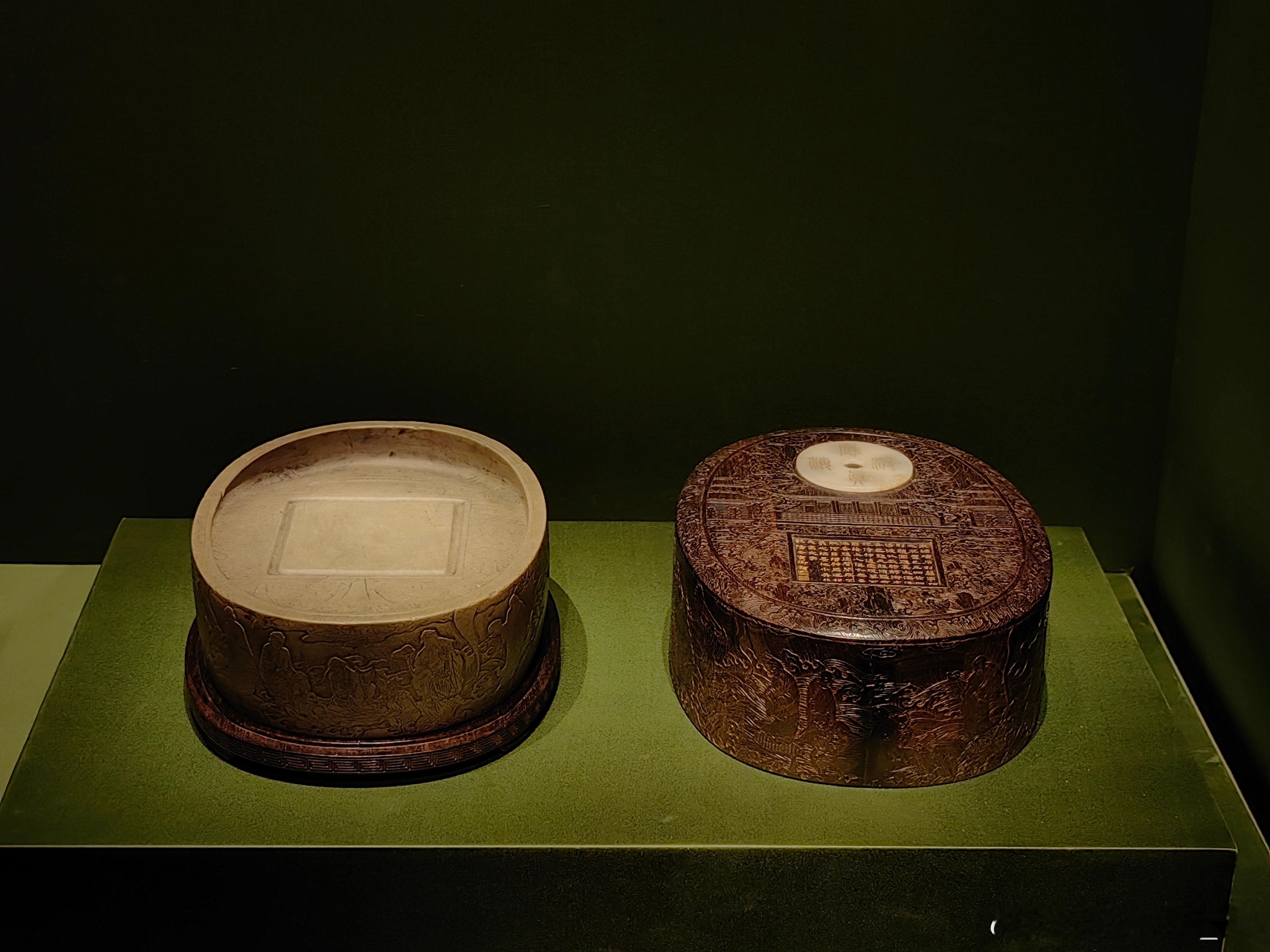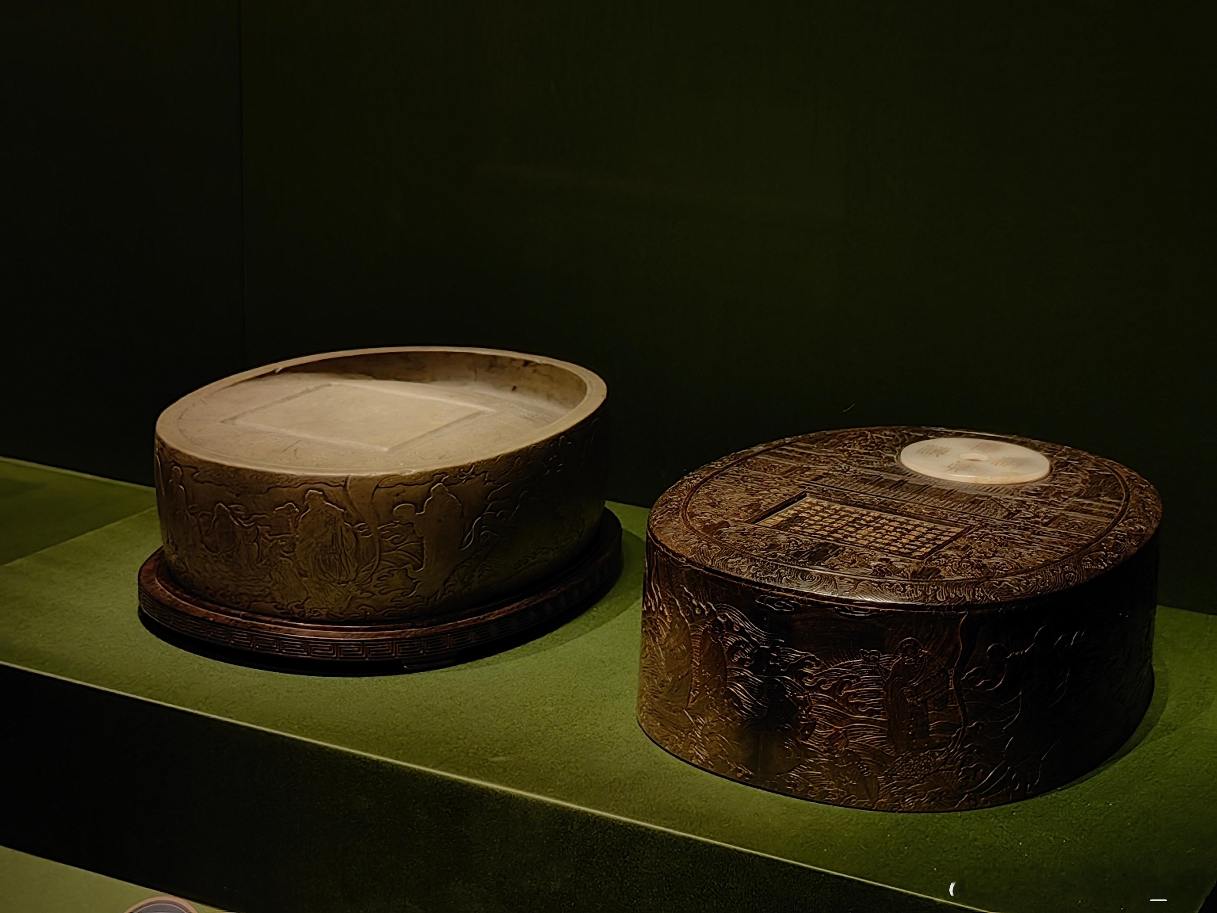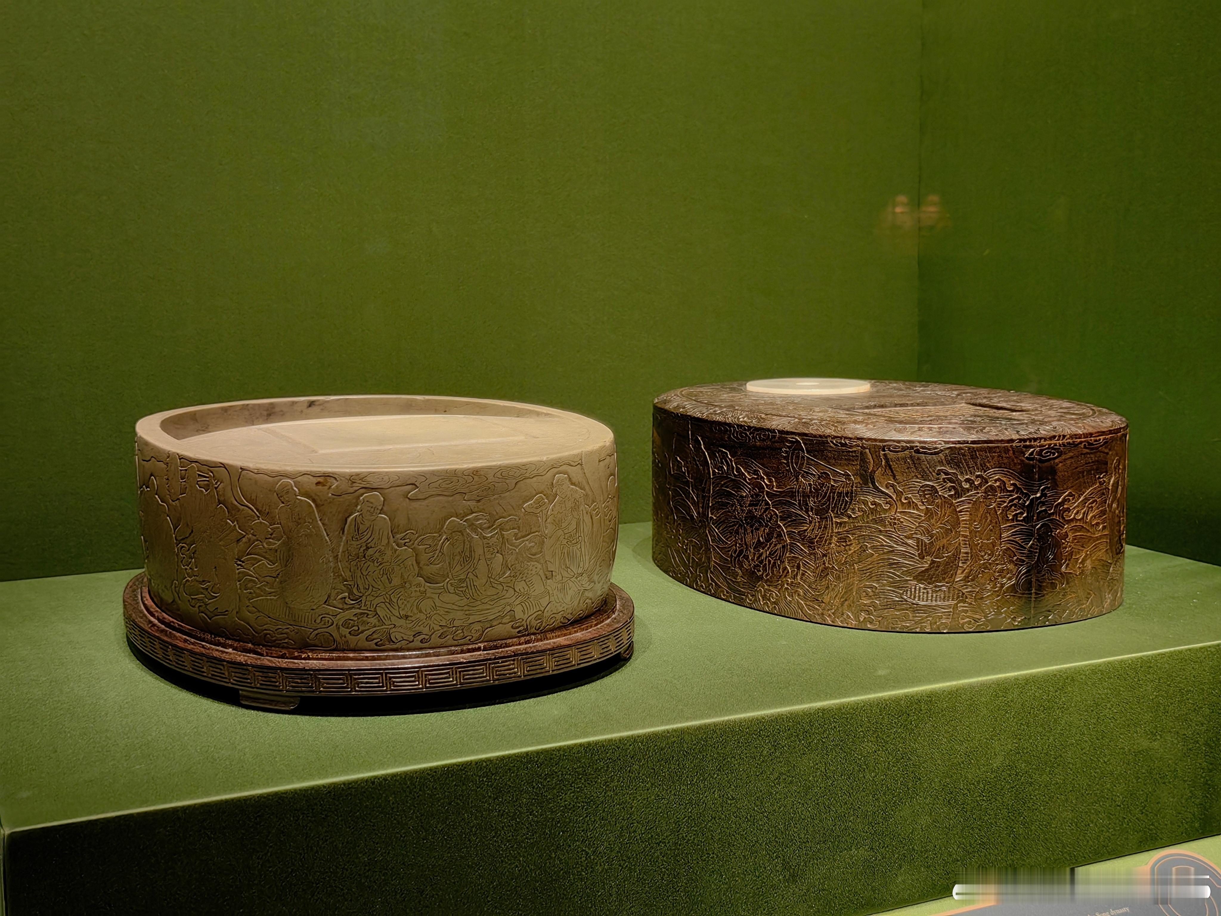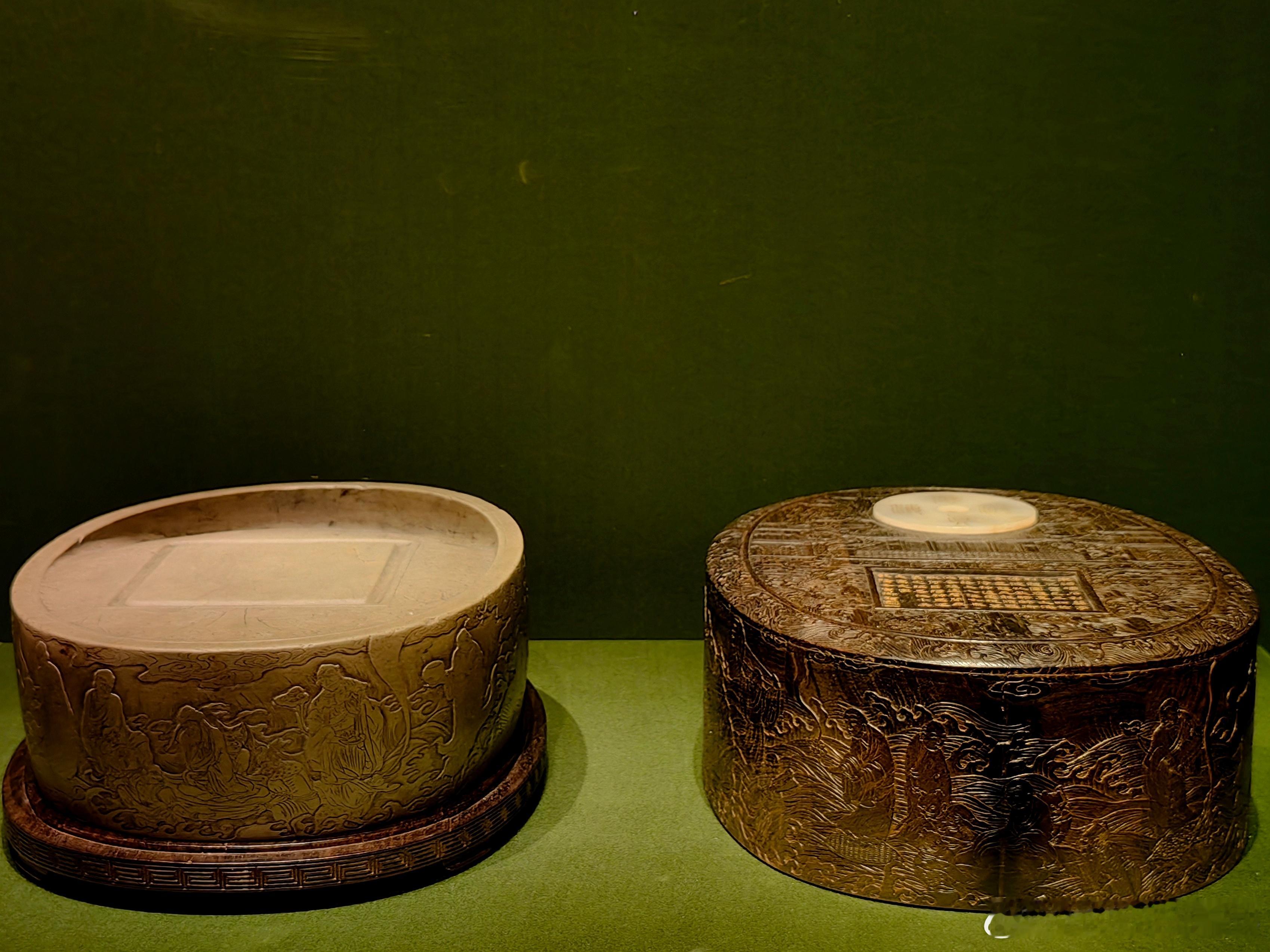 洮河石应真渡海椭圆砚宋 (960-1279年)故宫博物院藏这方砚台是洮河砚中的珍品,砚体为椭圆形,以洮河绿石制成,砚侧雕刻应真渡海的纹饰,砚盒为紫檀嵌玉工艺并刻有乾隆御题诗文,还曾被认定为端砚收录于《西清砚谱》,是清代宫廷鉴藏的重要文房器物。砚台主体为洮河绿石(洮河石),产自甘肃洮河,是中国四大名砚石之一,石色青绿温润、石质细腻莹洁,宋代起便为名贵砚材,宫廷尤重。存世宋代洮河砚本就稀少,宫廷旧藏的整料洮河砚更是罕见。百年守护-从紫禁城到故宫博物院 展出