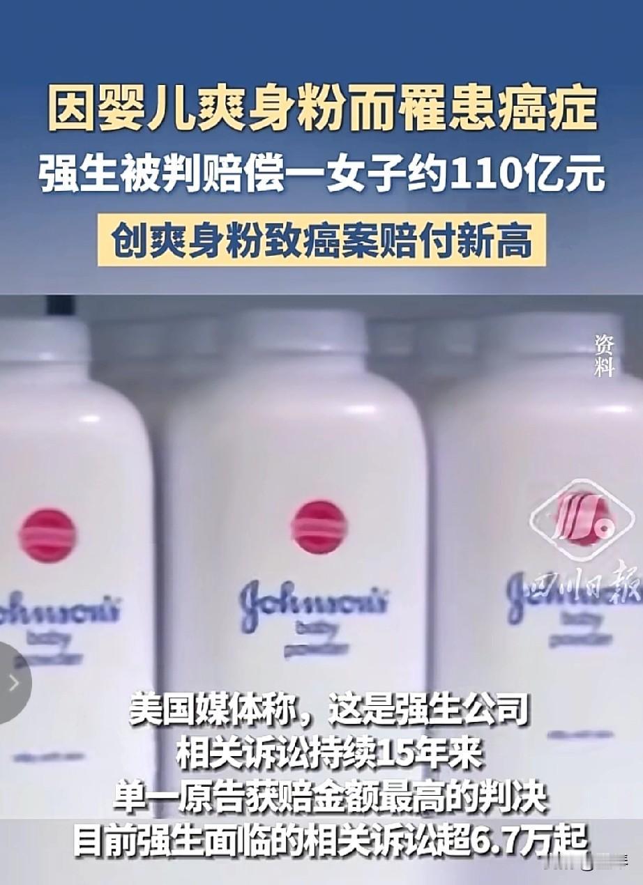 强生婴儿爽身粉致癌案判赔110亿,6.7万起诉讼背后到底藏着什么样的安全危机? 近日,强生公司因婴儿爽身粉致癌案迎来重磅判决,需向一名因使用其产品患癌的女子支付约15.6亿美元(折合人民币110亿元)赔偿,这一金额创下强生相关诉讼15年来单一原告获赔的最高纪录,瞬间引发舆论哗然。 陪审团认定,强生公司未能就婴儿爽身粉中含有石棉的风险向原告作出警示,需为此承担责任。而这并非强生首次因爽身粉致癌问题陷入诉讼,目前该公司面临的相关诉讼已超6.7万起,足见这一产品安全问题的严重性和持续性。面对此次判决,强生方面表示将立即启动上诉程序,试图推翻这一结果。 石棉是已被证实的致癌物质,长期接触会对人体健康造成极大危害,而婴儿皮肤娇嫩,免疫力较弱,使用含石棉的爽身粉风险更是加倍。 强生作为全球知名的母婴用品品牌,却未能把控产品原料安全,也未履行风险警示义务,不仅让消费者的健康遭受损害,也让品牌多年积累的口碑面临崩塌。 这起案件也给母婴用品行业敲响了警钟:产品安全是不可逾越的底线,企业必须严格把控原料采购、生产检测等各个环节,同时如实向消费者披露产品风险。 对于家长而言,选购母婴产品时也应更加谨慎,优先选择成分透明、口碑良好的品牌,避免因产品安全问题给孩子带来伤害。 你在选购母婴用品时会重点关注哪些安全细节?评论区分享你的经验吧。[比心] 爽身粉致癌?强生愿付7亿美元和解