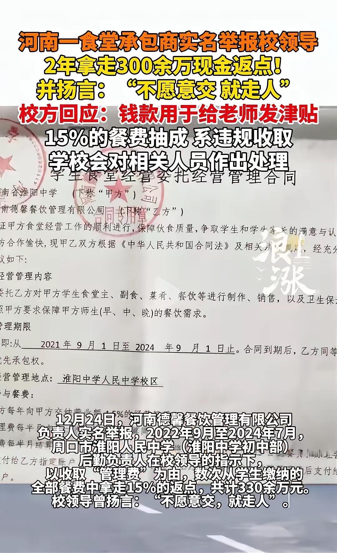 河南,一女子承包食堂,学校3000人,学校按每个学生每天20元收取餐费,她每年支付餐费的4.5%给学校作为管理费,可合同期内,学校领导却单方面将管理费涨至15%,并表示不愿意交就走人! 河南这事儿,听着就让人窝火。 女子承包着学校食堂,三千来个学生,每个学生每天餐费20块,这账算下来,看着数目不少,但食堂的成本摆在那儿——食材、人工、水电,哪一样都得花钱,利润本就薄得像层纸。当初签合同,说好每年支付餐费的4.5%给学校当管理费,大家按规矩来,也算相安无事。 可谁能想到,合同还没到期,学校领导突然变卦,一句话就把管理费涨到15%。这可不是小幅度调整,几乎是翻了好几倍。女子肯定不乐意啊,辛辛苦苦忙活,本来就赚不了多少,这么一涨,怕是得倒贴钱。可领导放出话来:不愿意交就走人。 这话听着就霸道得很。签好的合同,岂能说改就改?学校是教书育人的地方,更该守规矩、讲诚信,怎么能仗着自己是甲方,就这么欺负人?女子承包食堂,保障着几千学生的吃饭问题,背后是多少个家庭的信任,学校不想着怎么支持人家把食堂办好,反而在管理费上坐地起价,这吃相也太难看了。 要是真把人逼走了,新的承包商能不能接得住?饭菜质量、价格会不会受影响?最后遭殃的,不还是学生和家长?做生意讲究的是互利共赢,学校这样单方面毁约,寒的不光是承包商的心,怕是也会让大家对学校的公信力打个问号。 这事儿,到底该怎么解决,还得看有没有说理的地方。总不能让老实人受了委屈,让不守规矩的人占了便宜吧?