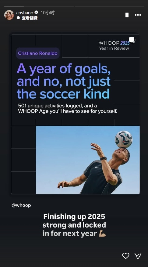 #C罗2025年健康报告#健康监测设备机构公布40岁C罗2025年度的健康报告,这一年记录了501项独特活动,并指出C罗的身体年龄为28岁,比实际年龄年轻12岁。2025年,C罗进行了足球、举重、板式网球、功能性健身、游泳等运动。其中,足球运动平均强度12.0、平均时长91分钟、平均心率为122次/分钟。2025年,C罗记录了超过40件事项,其中前10为:吃肉、冷冻疗法、桑拿、水果和蔬菜、冰浴、鱼油、肌酸、碳水化合物、咖啡因、维生素B12。恢复促进效果前5的是咖啡因、冥想、睡眠质量、吃肉和拉伸。C罗转发了这份报告并配文:“2025年圆满收官,明年蓄势待发💪🏼”