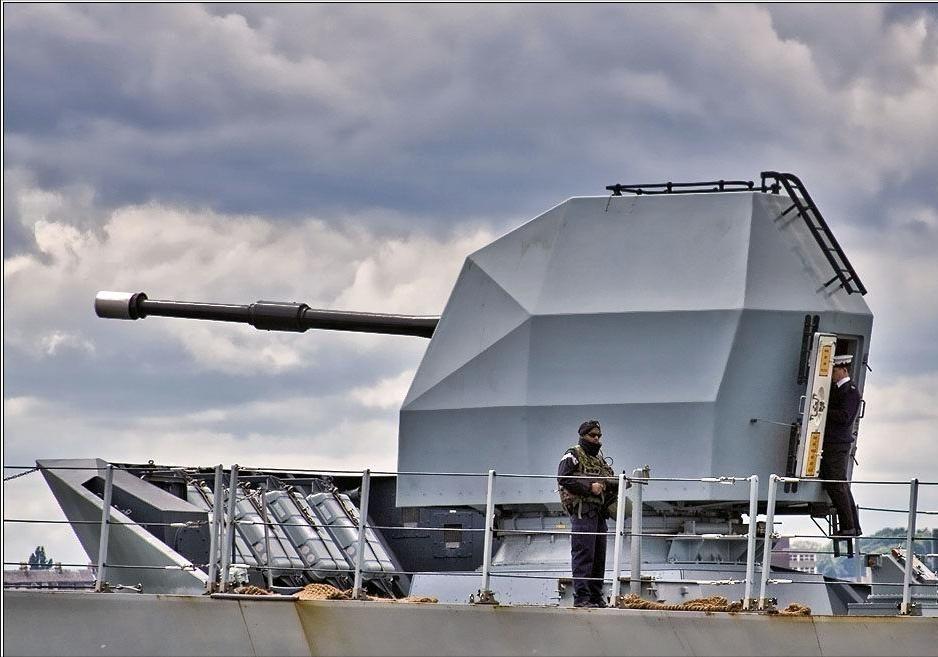 看英国海军MK-8 Mod1型114mm55倍径舰炮射击。 该炮弹丸重21公斤,初速868.7米/秒,最大射程约22公里,最大射速25发/分钟,炮管寿命为3300发。