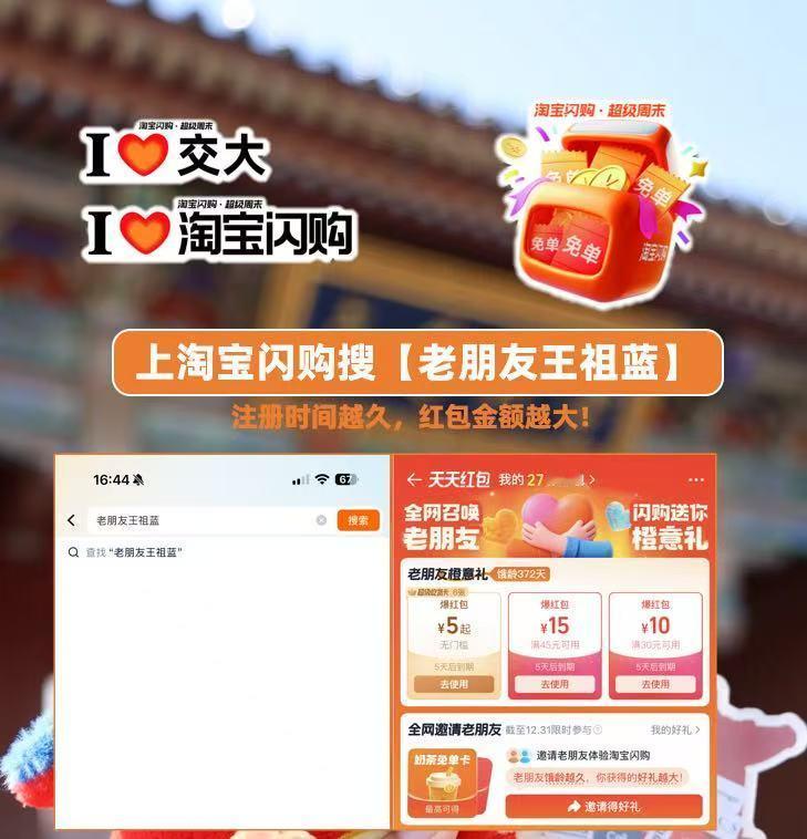16年陪伴,福利加码!淘宝闪购陪我从交大的青春岁月到如今的美好生活,从一人食到全家欢,王祖蓝着带老友专属礼回归,即日起至12月31日,上淘宝闪购搜【老朋友王祖蓝】,注册时间越久,红包金额越大!至高可领7张免单卡!邀请好友最高可额外再得免单卡~