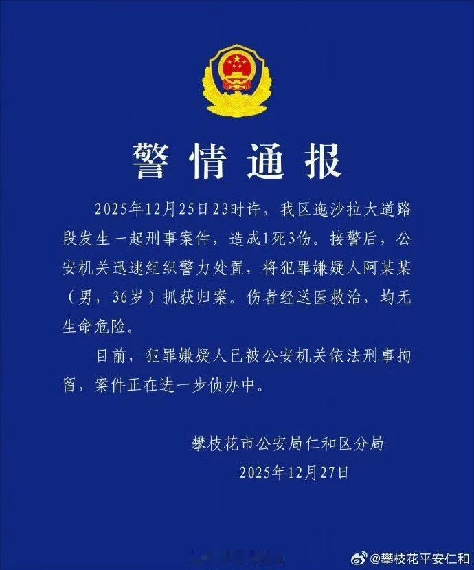 攀枝花刑案致1死3伤:暴力绝非法外之地! 2025年12月25日23时许,攀枝花市仁和区迤沙拉大道路段发生一起刑事案件,造成1人死亡、3人受伤的惨痛后果。 警方接警后迅速赶赴现场处置,当场抓获36岁犯罪嫌疑人阿某某,目前伤者经及时救治已无生命危险,嫌疑人已被依法刑事拘留,案件仍在进一步侦办中。 深夜街头突发的恶性案件,不仅击碎了几个家庭的平静,更让公众对公共安全心生忧虑。无论起因如何,以暴力手段宣泄情绪、伤害他人的行为,都严重践踏了法律红线与社会公序良俗。 法治社会容不得任何暴力行径的滋生,每一个公民的生命健康权都受法律严格保护。 期待警方尽快查清案件全貌,依法从严惩处凶手,给受害者家属一个公正的交代,也给社会公众一颗定心丸。