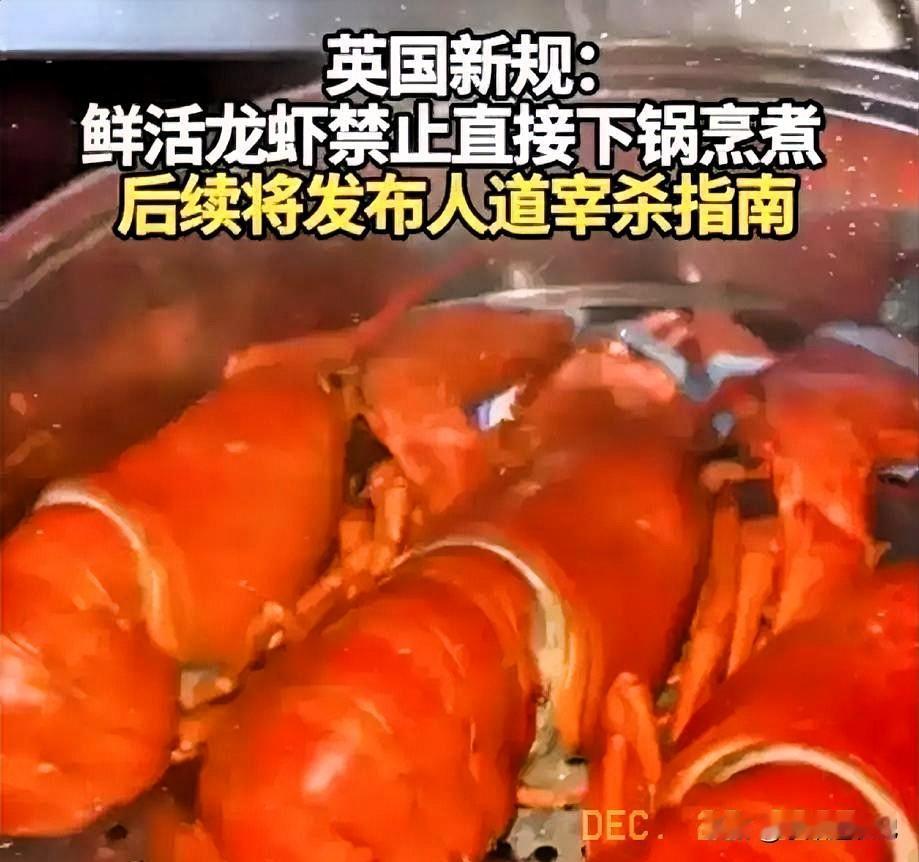 英国新规不让活龙虾直接放入沸水中煮,理由是不能残忍地对待动物。 弄昏龙虾的方法有三种,一是放入冷冻室,让它进入休眠状态。 二是使用电击装置,让龙虾在高电压下失去知觉。 三是往龙虾的脑部注入高浓度的酒精溶液,使其脑细胞死亡,达到致昏的效果。 英国法律规定必须先弄昏龙虾才能将它放入沸水中煮。这个规定引起了很多人的反感,欧美一些法律就喜欢把动物保护得特别好,对待动物就像对待人类一样。 可是,你们这些法律对待人类的暴力、贫穷、失业、吸毒、犯罪等问题却视而不见。你们这些法律是不是脑袋被门夹了,生孩子都没有人家那样讲究。 现在不让活龙虾直接放入沸水中煮,是因为科学研究表明这样做能减少痛苦,那有没有科学研究证明先弄昏龙虾就能减少痛苦?如果没有,那这条法律就是迷信,就是愚昧无知。