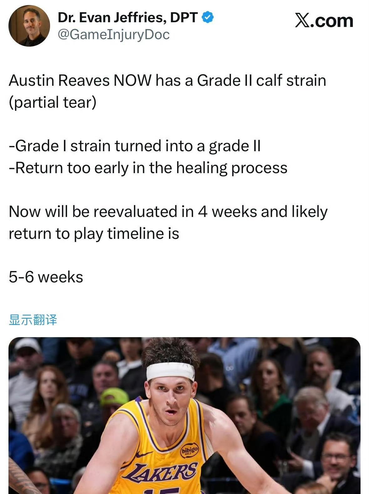 医学专家Dr. Evan Jeffries重磅爆料:里夫斯确诊二级小腿拉伤(部分撕裂)! 原本只是一级拉伤,却因康复期强行复出、背靠背全勤死扛40分钟——不管是客场鏖战还是垃圾时间,场场被摁在场上硬撑,直接导致伤情恶化! 球队计划四周后对他重新评估,回归赛场大概率要等五到六周! 为了战绩拿主力健康硬换,如今首发替补伤了个遍,这波操作真的值得吗?#里夫斯# #湖人伤病#