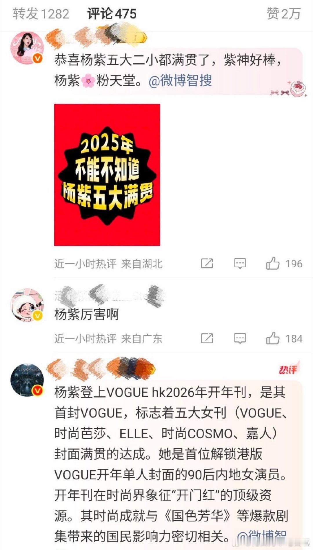 因为杨紫即将登上港版Vogue开年刊,网友在讨紫能不能算集齐了五大满贯? 杨紫香