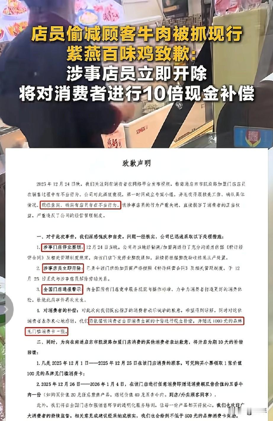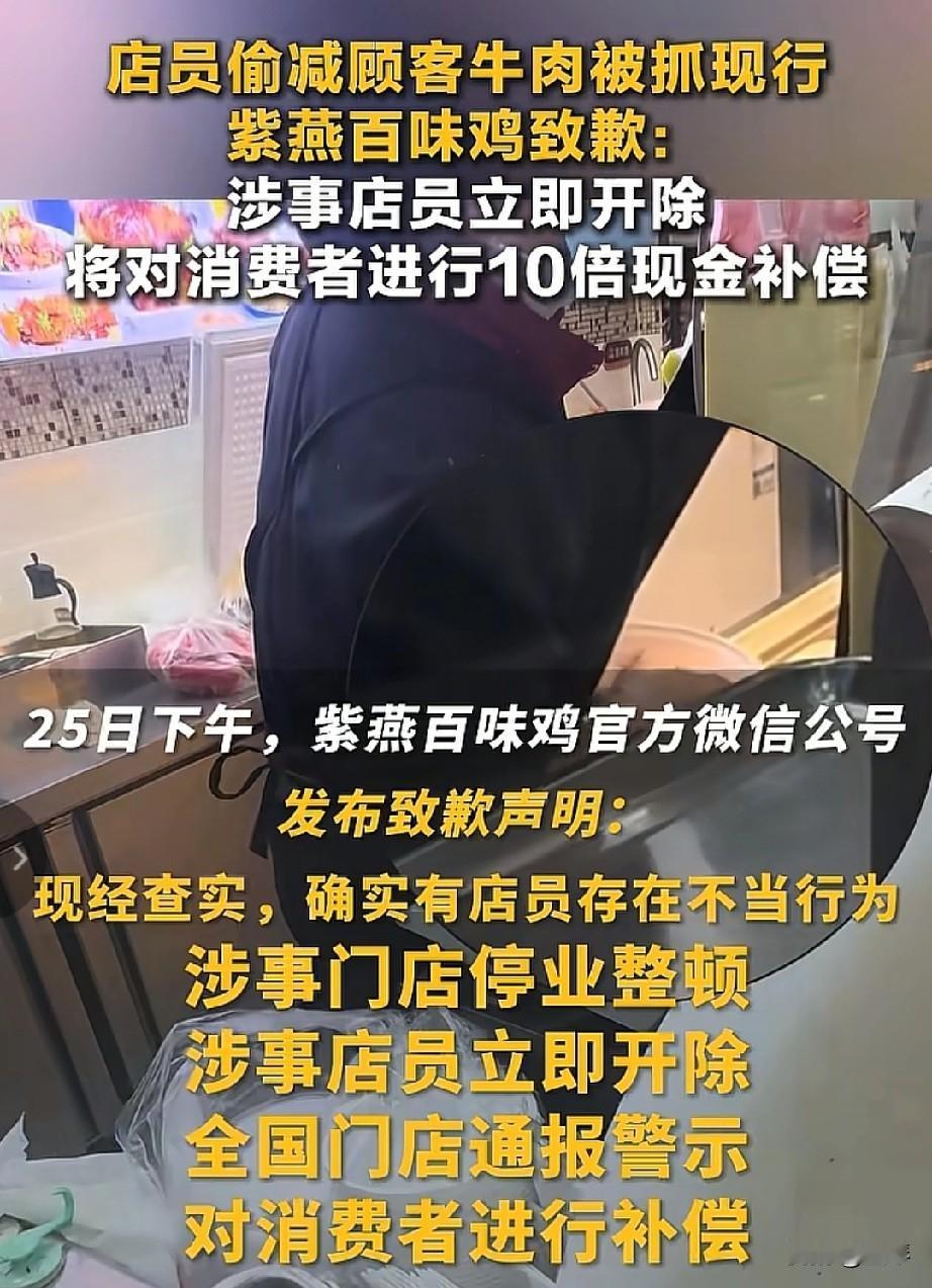 紫燕百味鸡店员偷减顾客牛肉被抓,诚信经营为何成了难题? 近日,紫燕百味鸡南通启东凯旋路加盟门店的店员,在销售过程中偷减顾客牛肉的行为被抓现行,这一事件迅速引发网友热议,大家纷纷感慨“连基本的诚信都做不到,还怎么做生意”。 事件曝光后,紫燕百味鸡在12月25日通过官方微信公众号发布致歉声明,明确表示经核查,涉事店员确实存在不当行为。 品牌方随即采取了一系列处理措施:涉事门店停业整顿、涉事店员立即开除、对全国门店通报警示,同时对涉事消费者按当日消费金额的10倍进行现金补偿,并赠送1000元品牌无门槛消费卡;此外,还针对该门店其他消费者推出了为期10天的补偿回馈活动。 看似诚意满满的处理方案,却依然难以平息消费者的不满。不少网友表示,店员偷减食材并非个例,餐饮行业中“缺斤短两”“偷工减料”的现象时有发生,背后反映的是部分门店管理的漏洞和从业人员职业素养的缺失。对于消费者而言,花钱消费本应获得对应价值的商品,店员的偷减行为不仅损害了消费者的经济利益,更让品牌的信誉大打折扣。 紫燕百味鸡作为连锁餐饮品牌,此次加盟店出现的问题,也暴露了连锁品牌在加盟门店管理上的短板。尽管品牌方迅速做出回应,但如何从根源上杜绝此类行为,加强对全国门店的监管和员工的培训,才是挽回消费者信任的关键。 诚信是商业经营的立身之本,尤其是餐饮行业,直接关系到消费者的切身利益,更应守住这份底线。 希望此次事件能给所有餐饮品牌敲响警钟,也提醒消费者遇到类似“缺斤短两”的情况时,要及时留存证据维护自身权益。你在消费时遇到过商家偷工减料的情况吗?评论区说说你的经历。[比心] 晒图笔记大赛餐饮