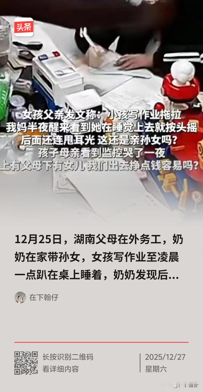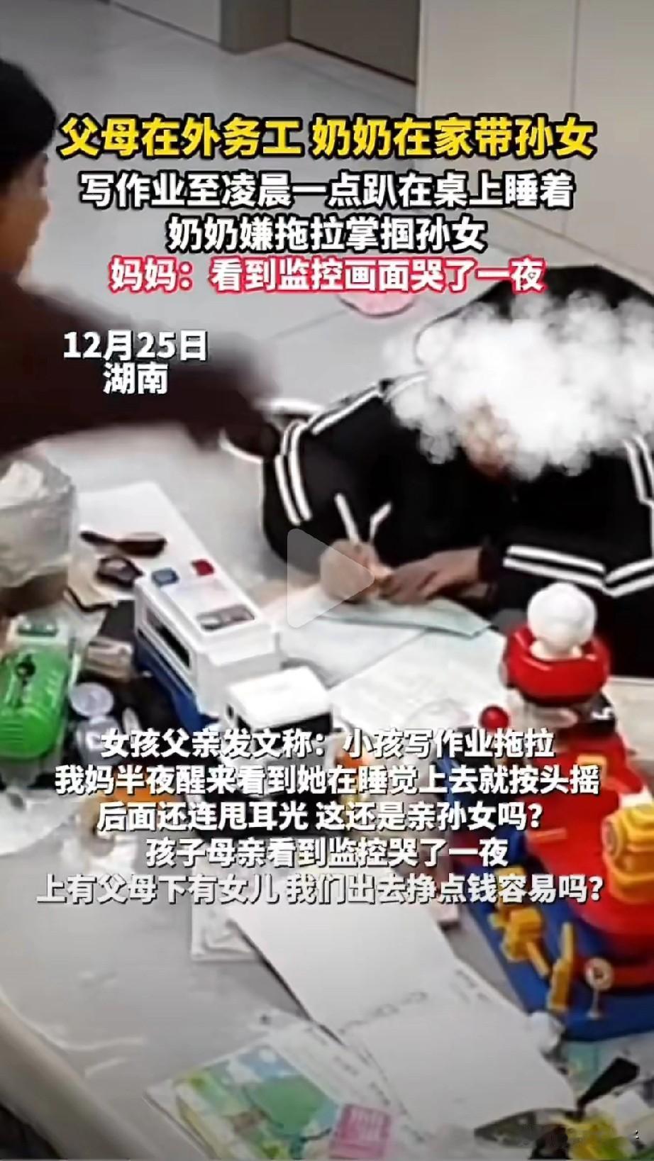 昨天湖南一则“奶奶狂扇写作业睡着孙女”的监控视频冲上热搜,引发全网热议。 面对质疑,涉事奶奶坚称“教育必须严厉”,表示孩子写作业磨蹭,自己说了十几次都不听,情急之下才动手,还直言“我们那代人谁没挨过打?现在小孩就是太娇气”。 事件发酵后,当地政府迅速介入,为女孩安排心理辅导,并组织老人参加家庭教育课程。李先生已采取紧急措施,在家中加装360度摄像头,委托邻居每日上门查看,同时与妻子决定年后辞职回乡,“哪怕去工地搬砖也要亲自带孩子”。 律师指出,该行为已触犯《反家庭暴力法》,属于家暴行为,长辈的“管教权”不能成为暴力的挡箭牌。即便出发点是为孩子好,也不能成为暴/力管教的借口。 这件事情的热议精准地击中了几个尖锐的社会痛点:隔代教育的困境、传统管教观念与现代教育理念的剧烈碰撞,以及留守儿童的情感世界。上一辈家长的共同逻辑:“严厉=负责,疼痛=记忆,打骂=关爱”。这种观念诞生于物质匮乏、教育方式粗放的年代,现在已经不适用。 长辈对孙辈的期待与操心本无可厚非,可把“陪写作业”变成“自我苛责”的极端举动,恰恰偏离了教育的初衷。辅导孩子本是为了帮孩子成长,却因一时焦虑用错了方式,既伤了自己,也容易给孩子留下心理阴影。 孩子写作业磨蹭、走神,或许是专注力不足,或许是知识点没吃透,家长不必过度自责或施压。面对这种平时母慈子孝,一辅导作业就“鸡飞狗跳”的场面,可以考虑通过晚托辅导等方式,在专业老师的陪伴下让孩子完成作业,既能保证学习效率,也能缓解家长的情绪压力。
