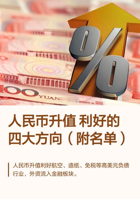 人民币升值利好的四大方向人民币升值受三大因素驱动:外部美联储降息预期致美元指数回落、中美利差收敛;内部出口韧性强(前 11 月贸易顺差破万亿)、经济边际改善 + 外资增配;政策端央行引导稳预期,企业集中结汇形成正向循环。✅ 四大受益方向 + 核心标的▫ 高美元负债 + 进口敏感型:$中国国航 sh601111$ 、南方航空、东方航空(汇兑收益 + 成本下降)▫ 进口依赖型制造业:$ST晨鸣 sz000488$ 、太阳纸业、荣盛石化(原材料进口成本降低,毛利率提升)▫ 消费服务(免税 / 出境游 / 跨境电商):$中国中免 sh601888$ 、携程集团、华贸物流(购买力提升 + 需求复苏)▫ 金融板块(券商 / 保险 / 银行):东方证券、中国平安、招商银行(外资流入 + 资产增值)人民币升值核心红利集中于 “成本下降” 与 “需求复苏” 两条主线,聚焦高关联度龙头标的即可把握机会。(资讯来源公开,仅供参考,不构成投资建议)