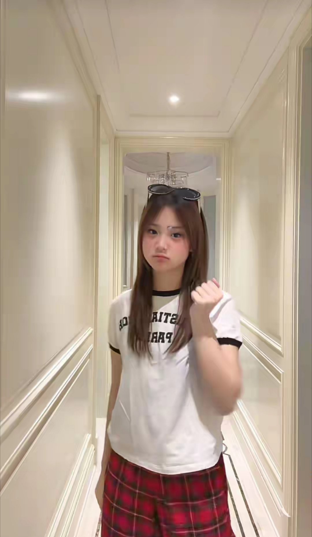 13岁甜馨在家跳手势舞:短袖+格纹裤,舒适又时髦,长得像贾乃亮