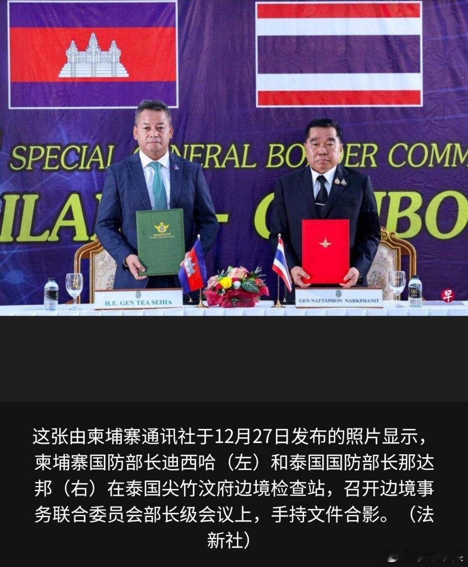 柬埔寨泰国正式停火泰国国防部长那达邦和柬埔寨国防部长迪西哈星期六(12月27日)签署一份联合声明,宣布两国同意立即停火。路透社报道,由柬埔寨发布的这份联合声明说:“双方同意,停火从当地时间27日中午12时起生效。无论在任何情况下或在任何地区,停止一切形式的武器攻击,包括停止攻击平民、民用设施、基础设施以及双方的军事目标。”双方同意冻结所有军队调动,并允许居住在边境地区的平民尽快返回家园。双方还同意在排雷和打击网络犯罪方面开展合作。海外新鲜事