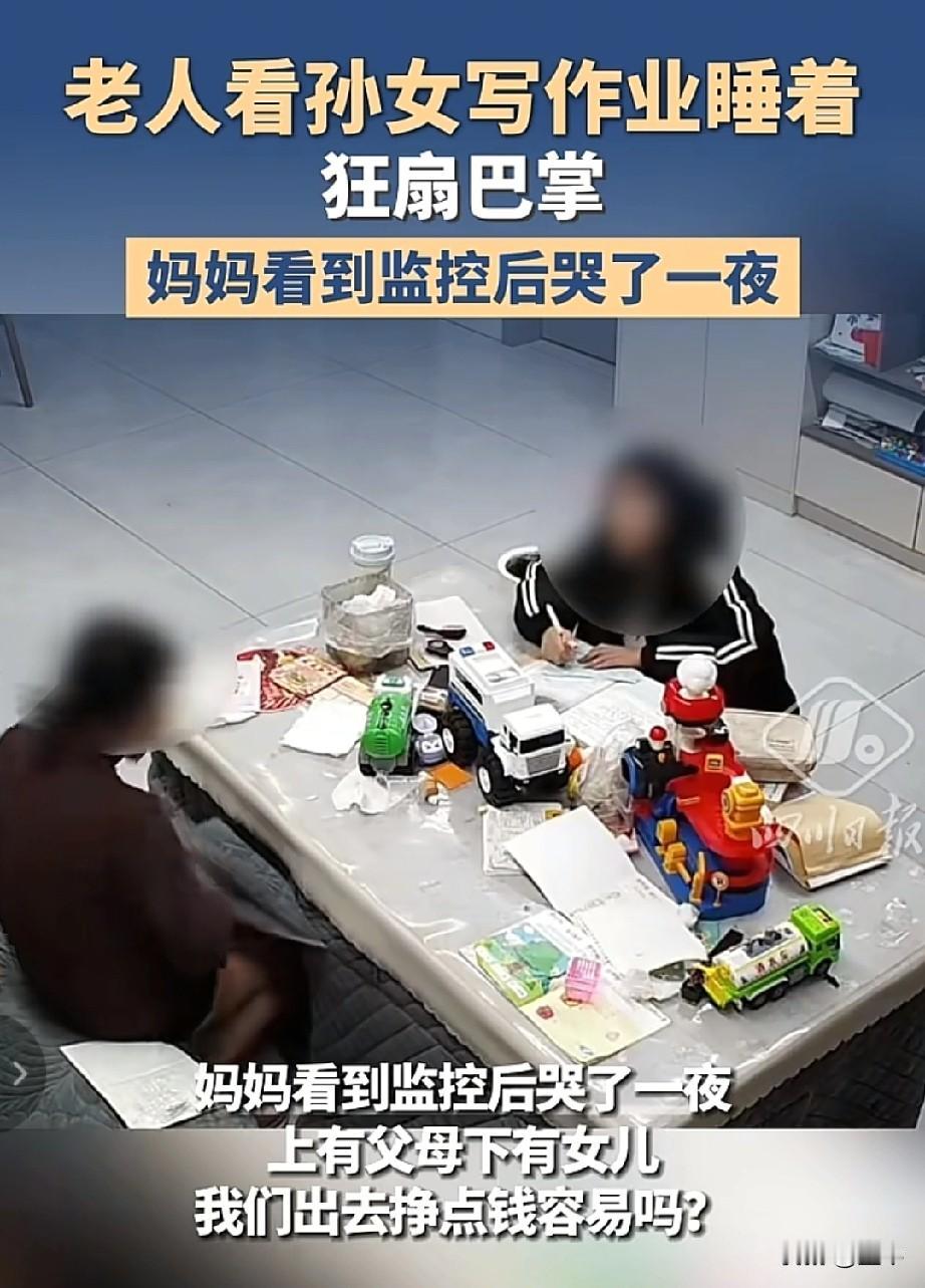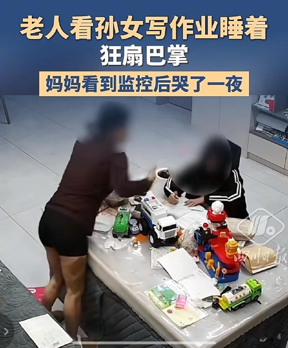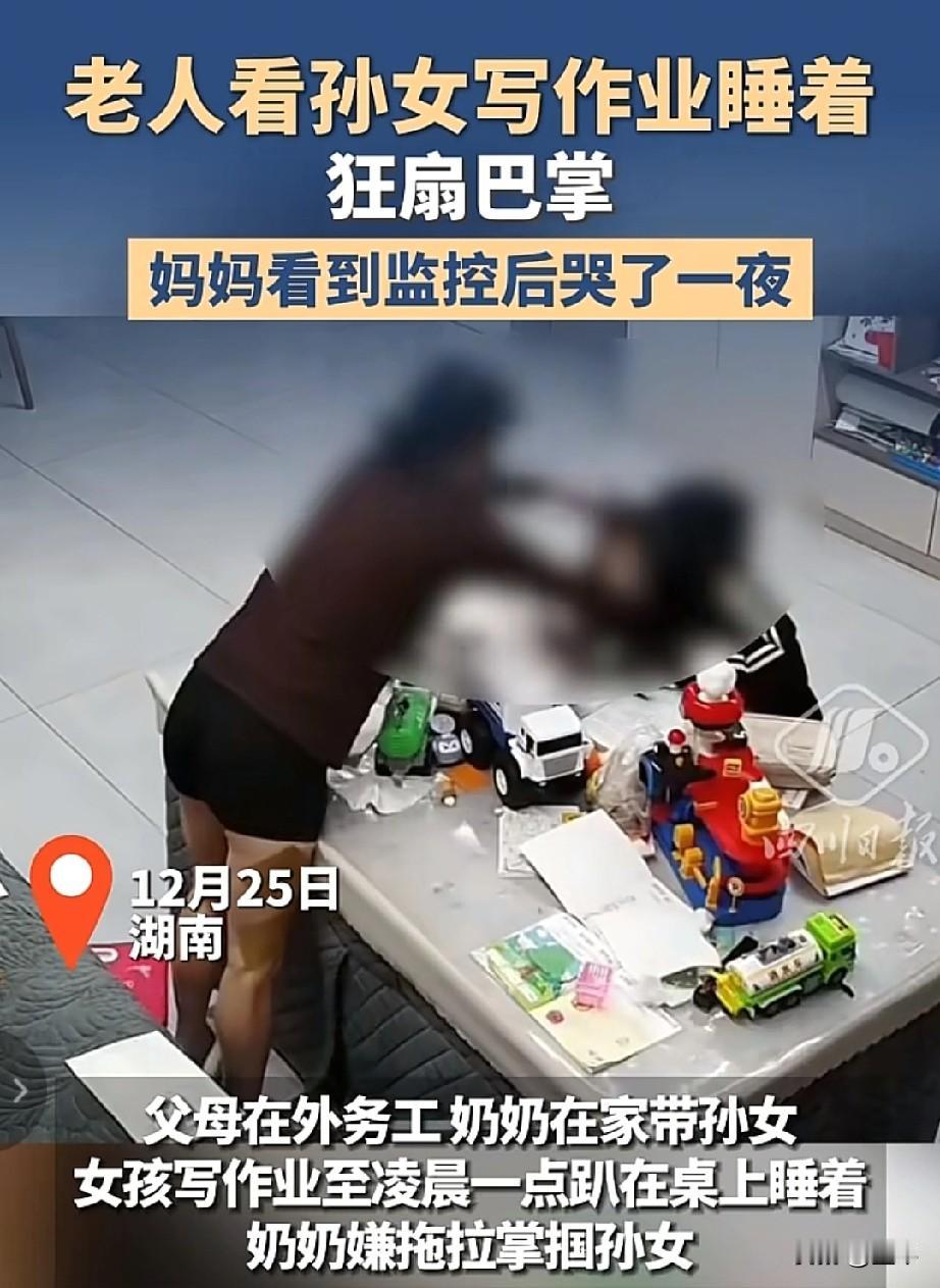 警惕,隔代教育正在毁灭你的下一代。 画面中凌晨书桌前的巴掌,打疼了孩子也戳中千万家庭的无奈。 看到监控里的画面,不禁让人心里发酸。此刻,湖南的小女孩正伏在堆满文具和玩具的书桌前,写作业到凌晨一点,熬不住困意趴桌睡着。 本该是心疼的奶奶,却因嫌孩子拖拉,抬手就给了孙女一记又一记巴掌。远在外地务工的妈妈看到监控,哭了整整一夜,那句“上有父母下有女儿,我们出去挣点钱容易吗”,道尽了无数外出务工父母的心酸。 为了生计,年轻人背井离乡打拼,把孩子留给老人照料,这本是无数家庭的无奈选择。 隔代亲本该是孩童成长里的温暖港湾,可这份陪伴,却有时会因为焦虑、急躁,变了味道。老人或许是盼着孩子更“争气”,或许是被深夜的疲惫磨没了耐心,但暴力永远不是教育的方式,掌掴落在孩子身上,伤的是身,更凉的是心。 我们理解生活的重压,理解隔代照料的不易,却更要清醒:孩子的成长需要耐心与温柔,而非苛责与暴力。 那些为了生活缺席孩子成长的父母,那些承担起照料责任的老人,都该明白,比起“望子成龙”的急切,孩子的身心健康才是最珍贵的。 愿这记凌晨的巴掌,能打醒更多人,别让生活的苦,化作对孩子的伤害;别让隔代的陪伴,成为童年的阴影。多一份耐心,少一份苛责,才是对孩子最好的守护。 隔代育儿那些事