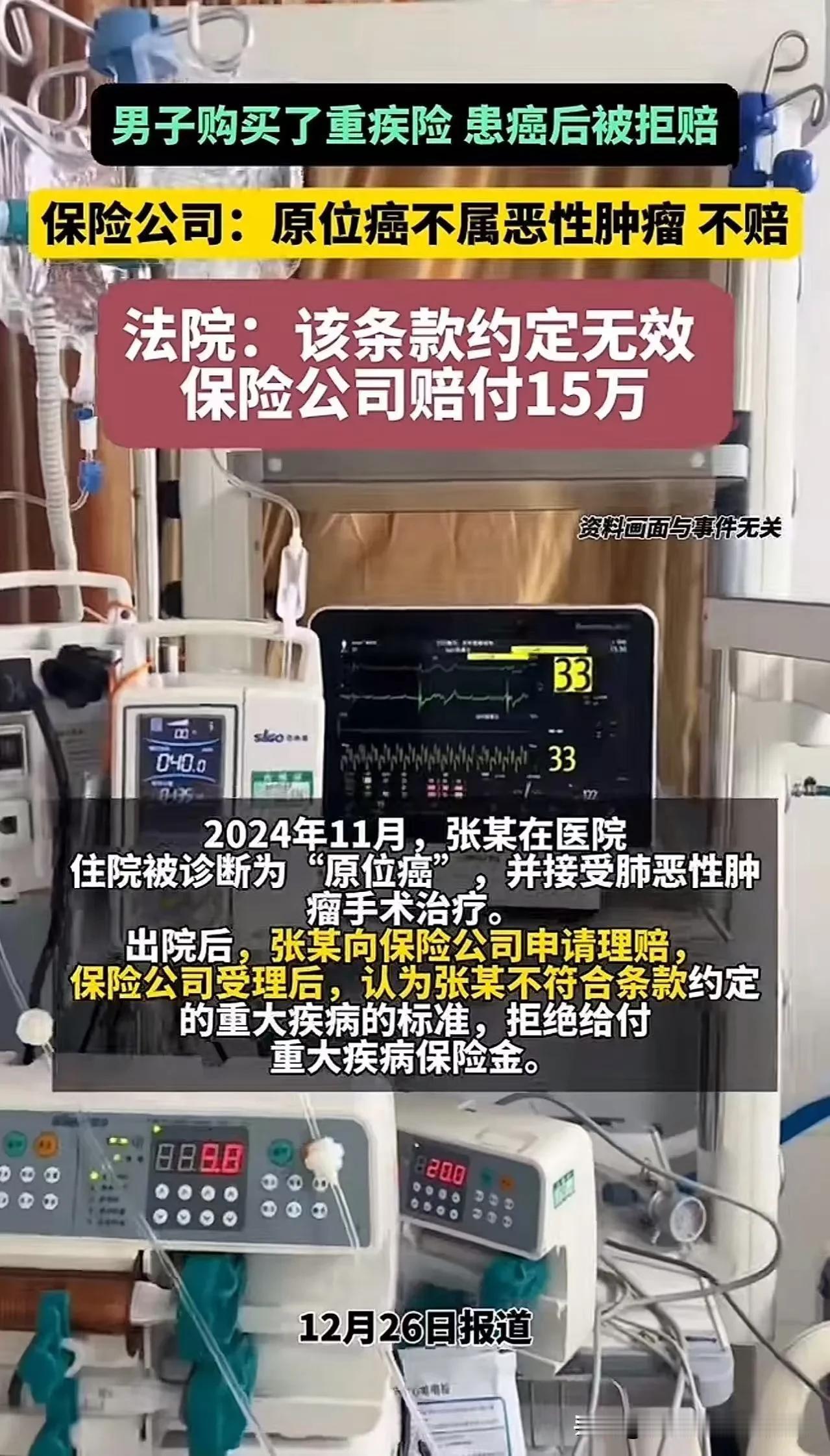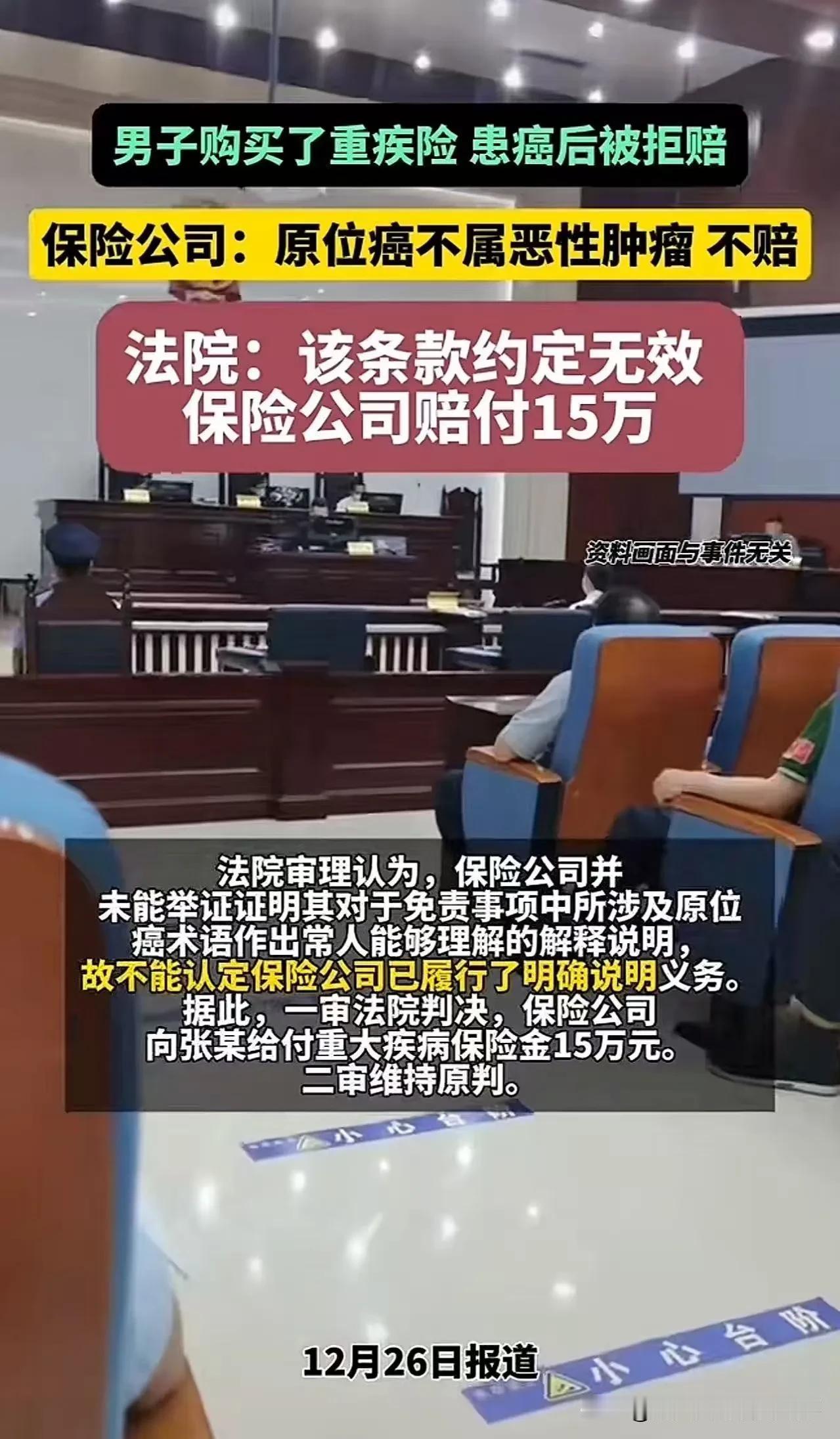 法院最终判决保险公司赔付,核心原因是免责条款未履行明确说明义务,而非原位癌绝对不属于理赔范围。 从行业规则和法律层面看: - 医学上原位癌属于“癌前病变”,部分重疾险会将其列为“轻症”单独保障(给付基本保额的25%左右),但也有产品明确将其排除在“恶性肿瘤——重度”之外 ; - 关键争议点在保险销售环节:根据《保险法》,免责条款需以明显方式提示,且要向投保人作出“常人能理解”的解释,否则条款无效 。案例中保险公司未举证说明已讲清“原位癌不赔”的含义,法院因此认定免责条款失效,判决赔付15万元 。 网友吐槽的“投保时啥都赔,出险时这也不赔”,本质是投保人与保险公司的信息不对称——专业条款中的医学、法律概念若未被清晰解读,投保人的合理期待就容易落空。 素材来源于网络,侵权删除。