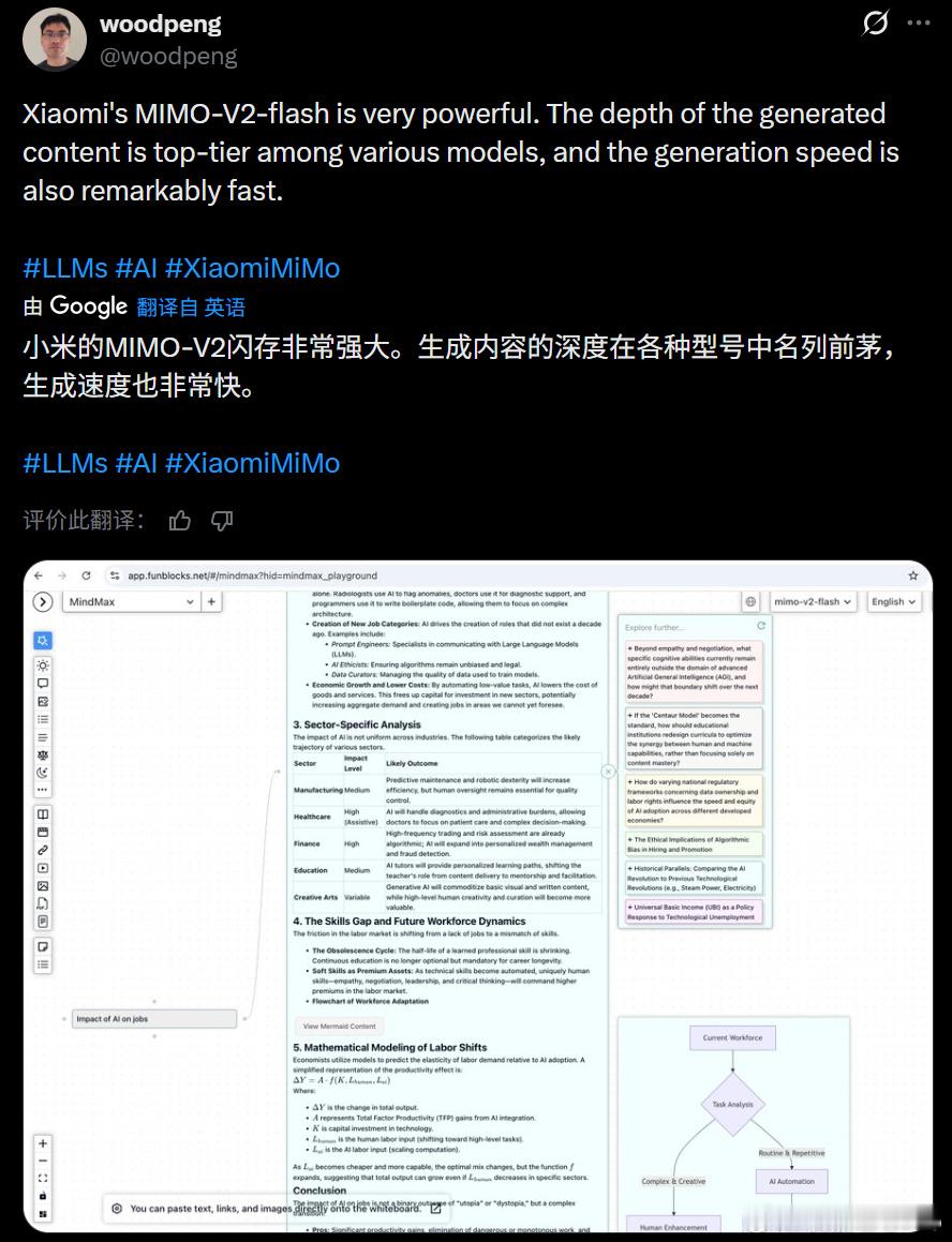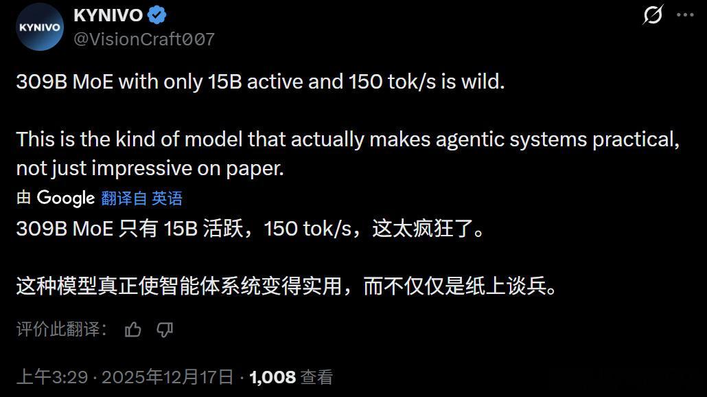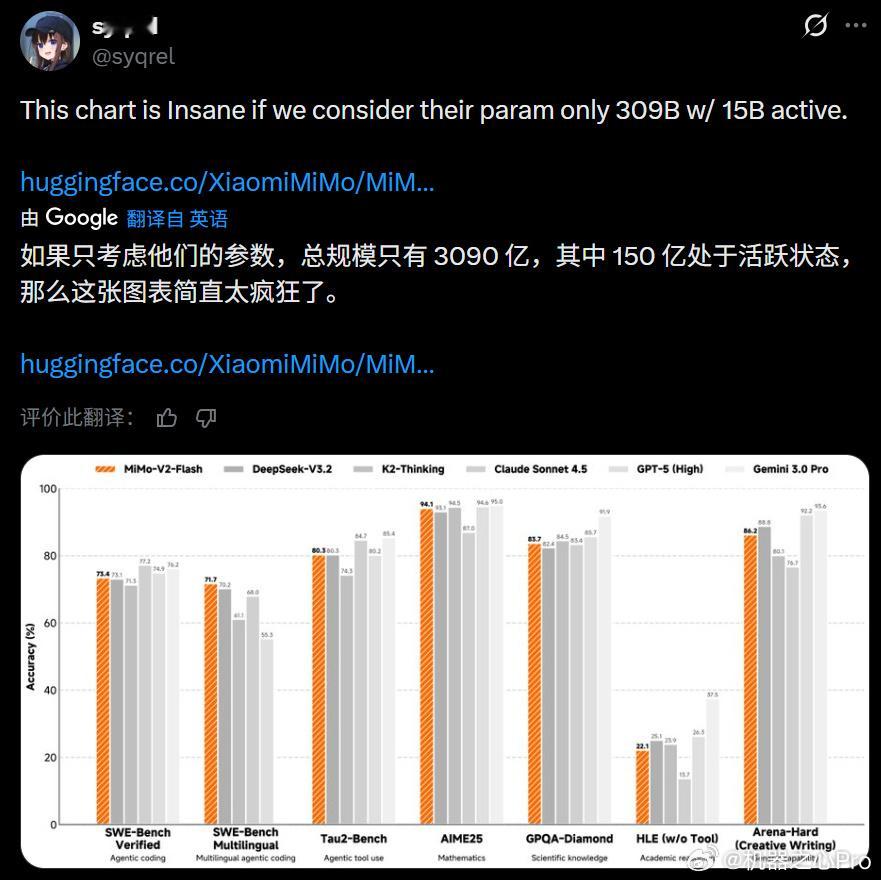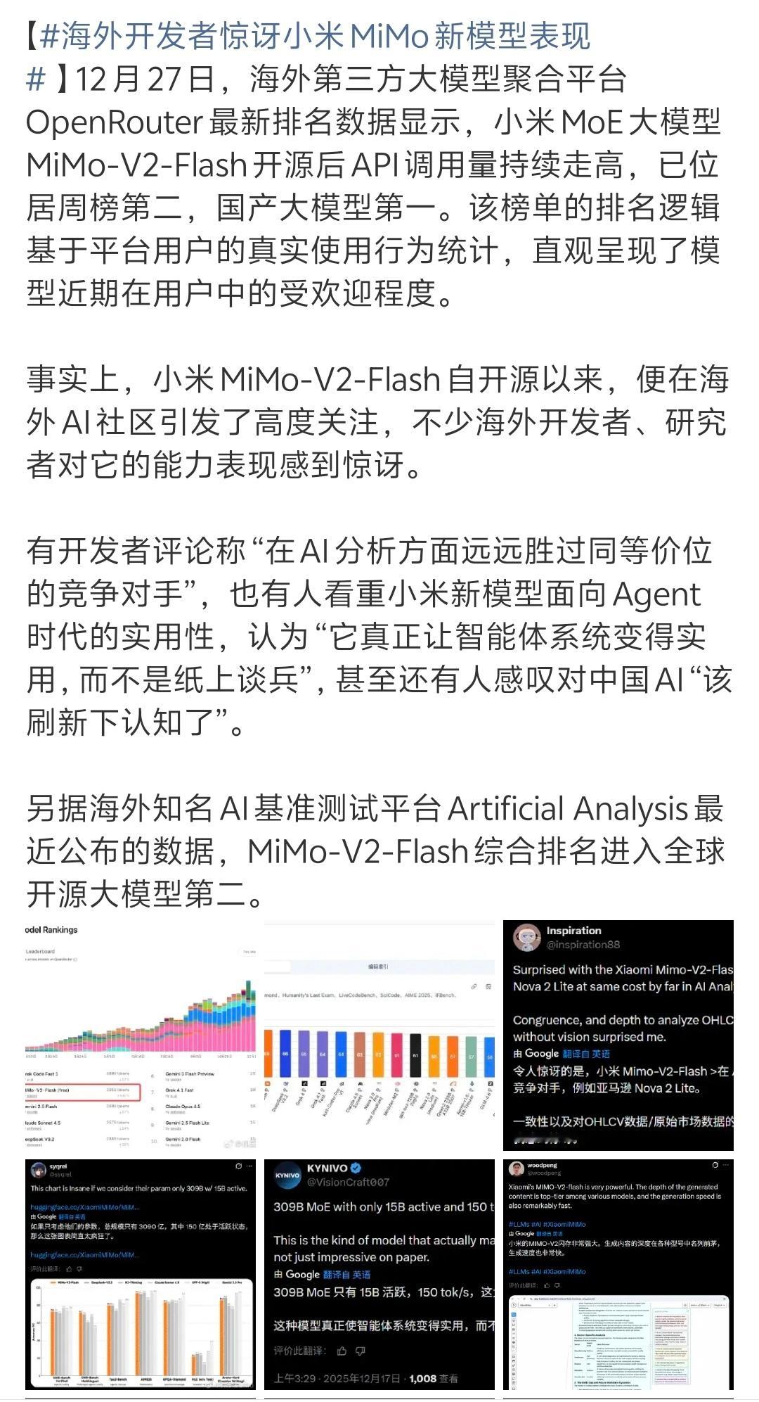 这次小米是真的“有点东西”!国产大模型在海外迎来了高光时刻,小米MoE大模型MiMo-V2-Flash开源后,直接在海外AI社区引发热议。数据显示,其API调用量持续走高,在OpenRouter平台上已位居周榜第二,更是拿下了国产大模型第一的宝座。更让人惊喜的是海外开发者的真实评价。不少老外直言被MiMo的表现“惊到了”,认为它在AI分析方面远超同等价位的竞品。特别是它极高的性价比和目前免费的政策,被不少人称为“Gemini平替”,关注度完全不输同期发布的Gemini3 Flash。有开发者感叹,这才是真正面向Agent时代实用的模型,对中国AI的实力表示“该刷新认知了”。除了基于用户真实行为的调用数据,在知名基准测试平台Artificial Analysis的榜单上,MiMo-V2-Flash综合排名也进入了全球开源大模型第二。口碑与数据双丰收,小米在大模型领域的进步肉眼可见。这不仅是对中国开源技术的认可,也证明了国产AI正在全球范围内赢得越来越多的尊重。期待小米未来带来更多惊喜!