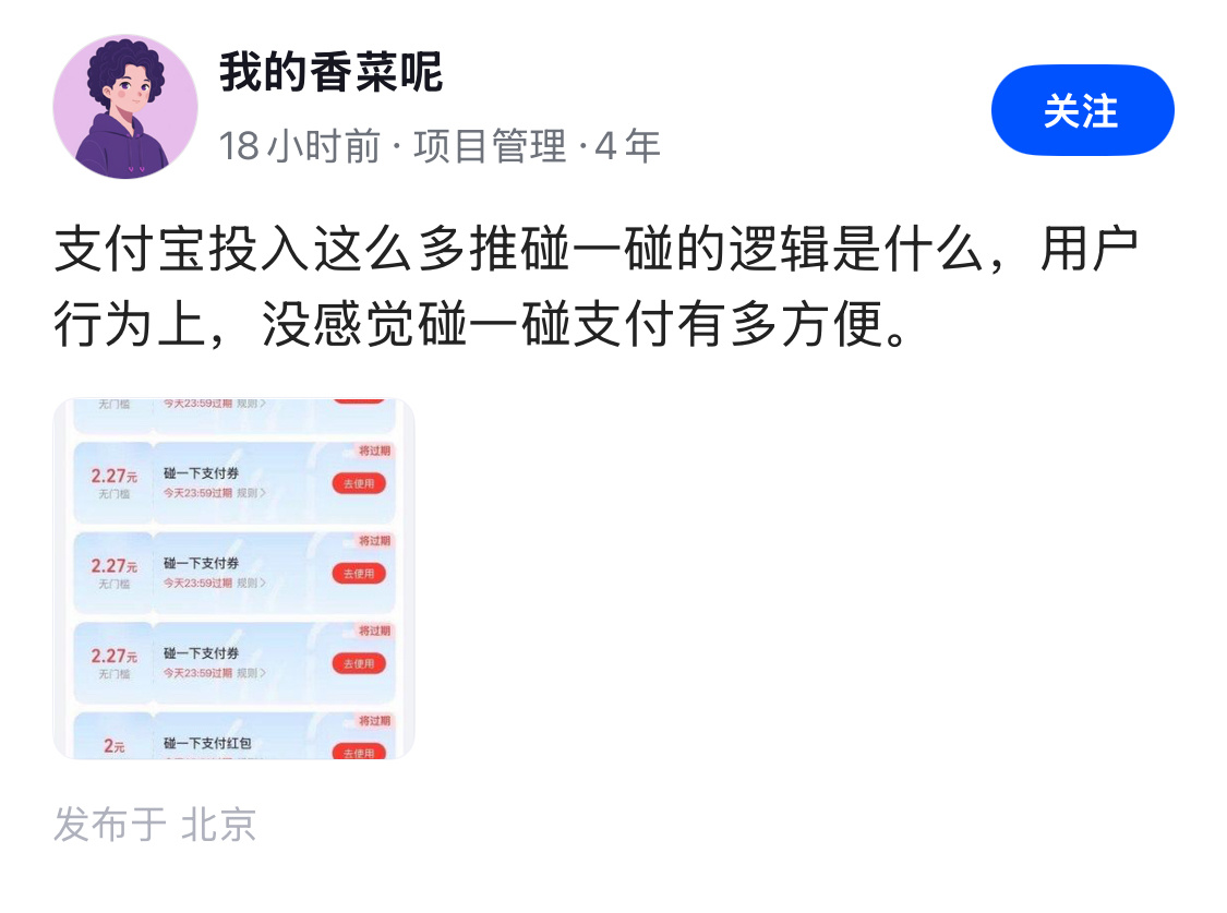 碰一碰支付还是很方便的,特别是安卓用户。等大家都完全养成碰一下支付的习惯,就没人用微信支付了。达到垄断的条件,阿里就是躺赚。