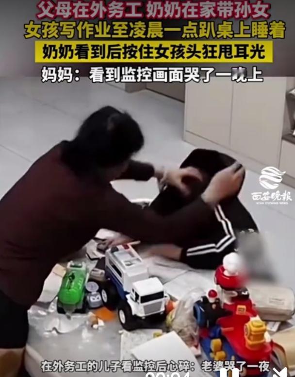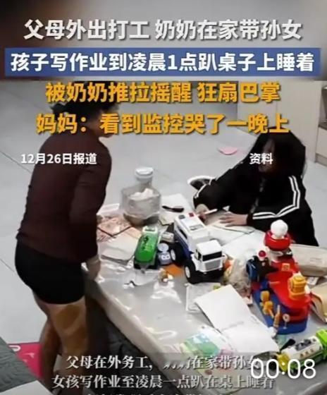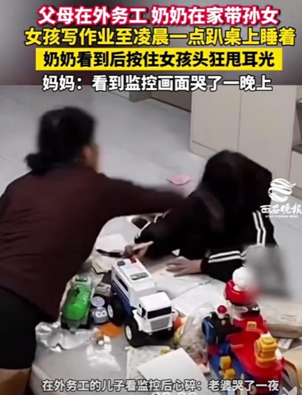 后续!留守女孩凌晨学习被奶奶狂扇巴掌,妈妈哭了一夜,父亲发声 监控画面里的每一记耳光,都像抽在千万人的心尖上。12月25日凌晨1点,湖南农村的灯光下,10岁留守女孩趴在作业本上沉沉睡去,小手还攥着笔,台灯映着她疲惫的脸庞——这是她从傍晚写到深夜的成果,终究没熬过困意。起夜的奶奶见状瞬间暴怒,按住女孩的头狠狠摇晃,随后左右开弓扇下耳光,清脆的巴掌声隔着屏幕都令人揪心,女孩全程不敢反抗,只低着头默默啜泣,脸颊很快红肿起来。 远在外地打工的妈妈通过监控目睹全程,整整哭了一夜。父亲的发声更戳中无数打工人的痛点:“这还是亲孙女吗?妻子看监控哭了一夜,上有父母下有儿女,我们出去挣点钱容易吗?” 简单的话语里,满是无力与愧疚。事后村委会和妇联迅速介入,奶奶坦言,自己操持家务又要盯孩子学习,看到作业没写完就睡觉,一时情绪上头才动手,并非故意虐待。 可这场闹剧的背后,哪是“情绪上头”那么简单?这是千万留守家庭的缩影:96%的留守儿童由祖辈照料,祖辈文化水平有限、不懂科学教育,只能沿用“棍棒底下出孝子”的老办法;父母背井离乡,为了碎银几两不得不缺席孩子成长,安装监控能看见却护不住,满心愧疚却无力改变。女孩沉默顺从的模样更让人心疼,长期缺乏父母陪伴、承受隔代教育的矛盾,让她早已习惯了隐忍,而这种隐忍背后,可能是难以磨灭的心理创伤——数据显示,留守儿童的抑郁检出率高达29%,社交焦虑检出率更是达到36.1%。 有人骂奶奶狠心,也有人共情她的不易,更多人看懂了现实的无奈:放下工作养不起娃,拿起工作陪不了娃。万幸的是,父母已决定尽快辞职接孩子到身边,这场深夜的巴掌,终于敲响了成长不能缺席的警钟。隔代亲本是温暖的守护,却不该变成暴力的借口;生活的压力再大,也不能让孩子成为矛盾的承受者。 每个熬夜学习的孩子都值得温柔以待,每个背井离乡的父母都心怀牵挂,每个操劳的祖辈都藏着苦衷。但爱不该是情绪化的发泄,教育更不是暴力的借口。你觉得奶奶该被原谅吗?留守家庭的困境该如何破解?欢迎在评论区留下你的看法。打孩子耳光事件 怒扇孩子耳光