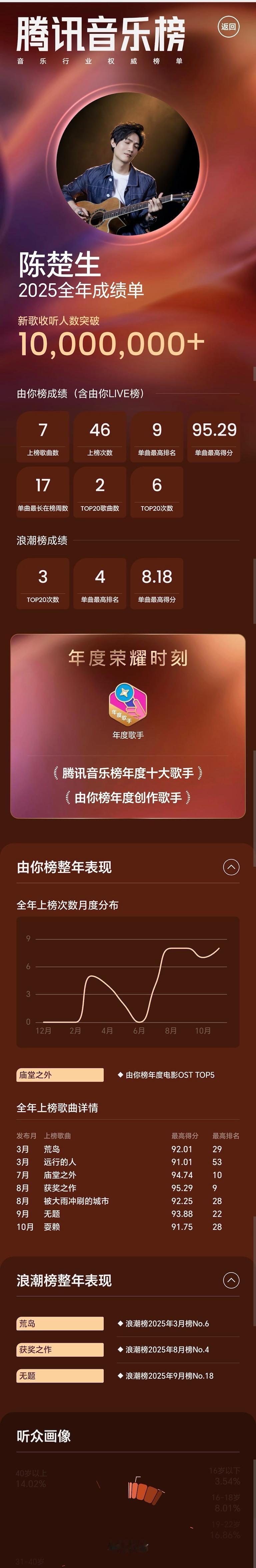 陈楚生2025腾讯音乐全年成绩单及听众画像来了! 2025年生哥战绩不错,不仅获得重量级奖项,新歌的成绩也很棒。 他的听众画像年龄分布比较均衡,涵盖了各年龄层,男女比例也比较接近,具体如下: 16岁以下3.54% 16-18岁8.01% 19-22岁16.86% 23-30岁26.82% 31-40岁30.75% 40岁以上14.02% 性别分布:男性48.76%,女性51.24%。
