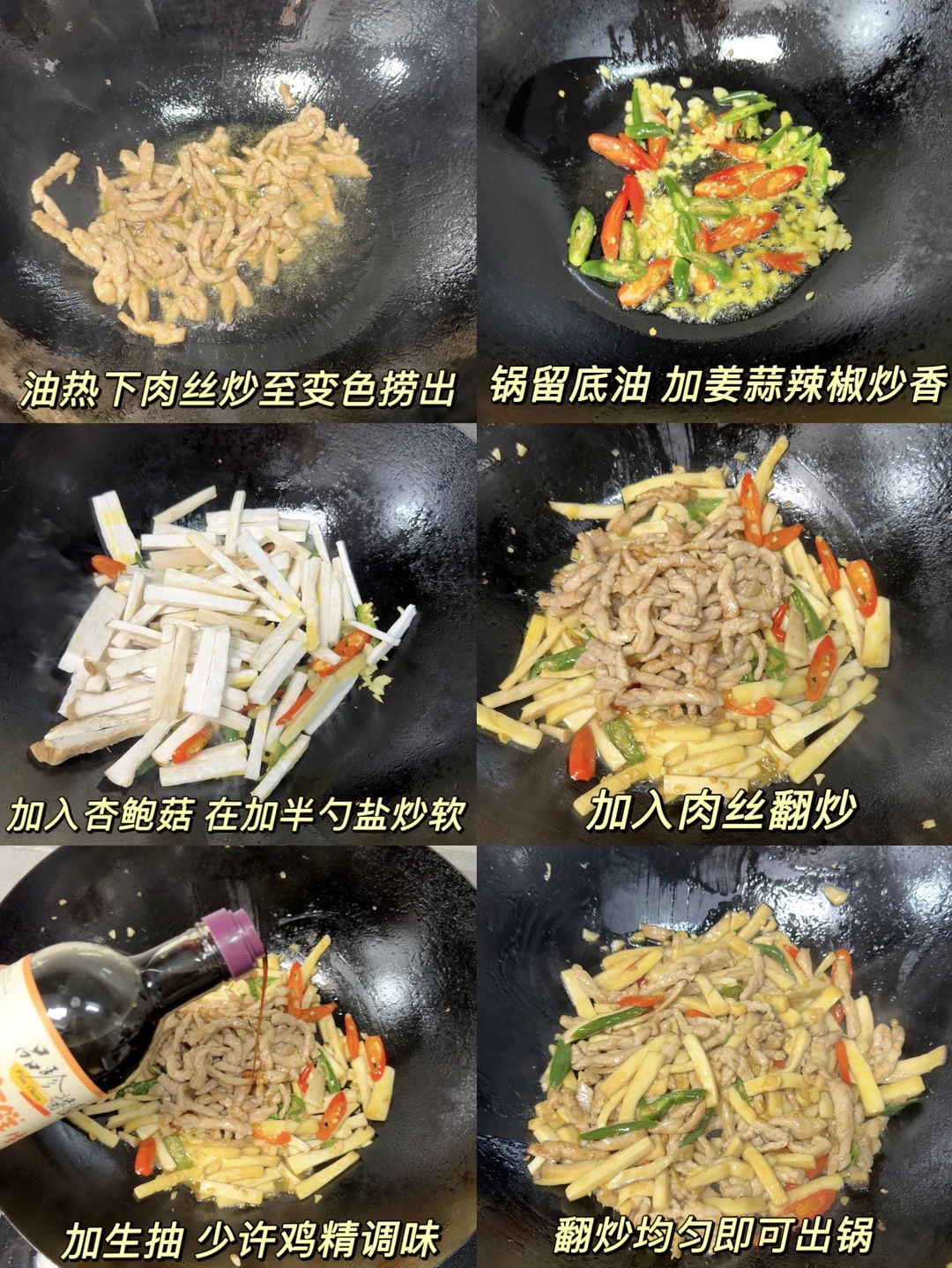 3️⃣放入杏鲍菇,加入小半勺盐炒软,加入肉丝翻炒均匀