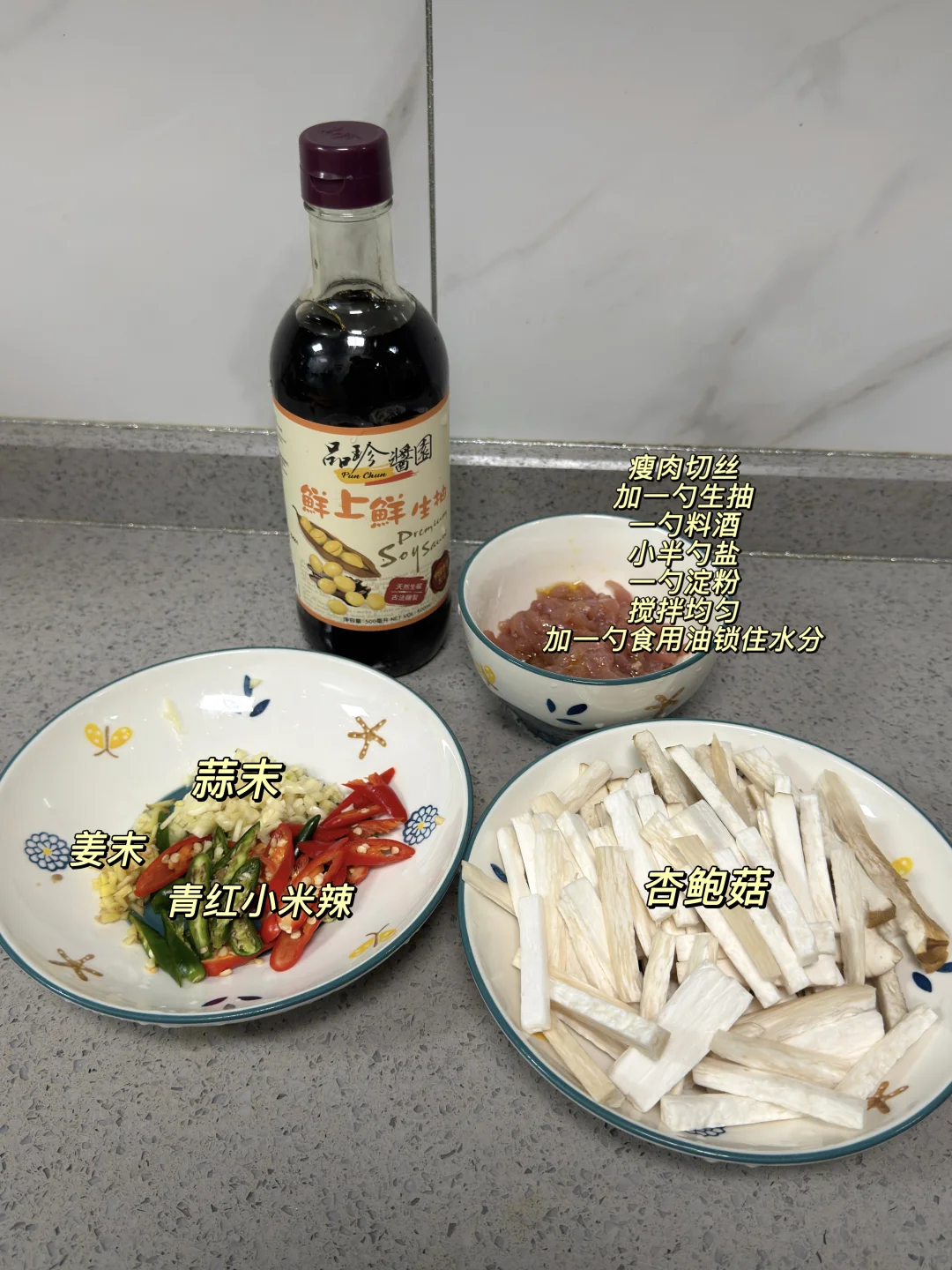 食材:瘦肉、杏鲍菇、辣椒、蒜末、姜末