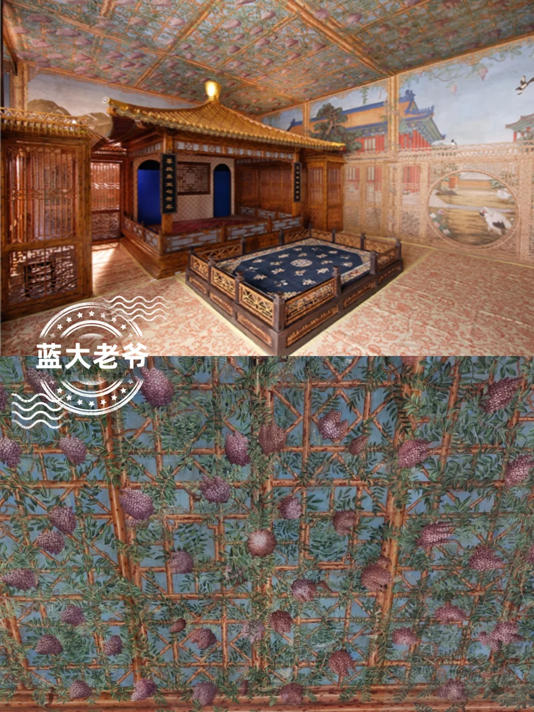 🌅宁寿宫倦勤斋西室面东小戏台,竹纹方亭,篱笆围合,靠北后檐墙为满墙竹篱笆院落壁画,上挂藤萝与顶棚绘相同图案的天花连成一片,自然立体别具一格,此区域通景画由内务府如意馆画师绘于乾隆40年前后,多供南府太监唱岔曲小戏。