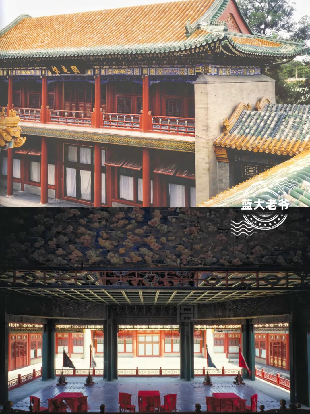 🌅长春宫戏台,咸丰九年改启祥宫后殿为穿堂体元殿,同治十三年殿北出抱厦三间,可做演戏之用,整体素雅简洁,慈禧五张贺寿在此开过戏,她是射手的,冬天演戏前搭玻璃棚暖台,夏搭凉棚,见烫样。