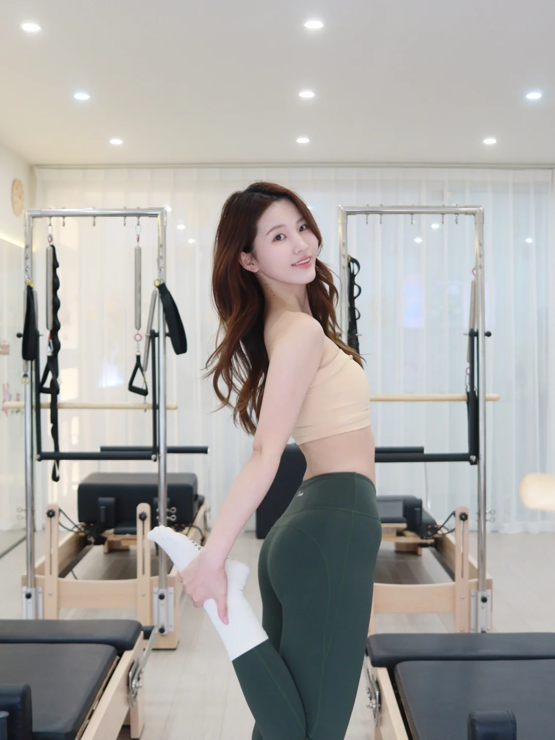 最近练器械普拉提一直穿IYOGA艾瑜嘉的这套裸感瑜伽服,简直是为运动量身定做的~ 抹胸款的上衣承托力超够,做大幅度拉伸也不会移位,搭配的墨绿瑜伽裤包裹性绝了,高腰设计把腰线和臀线勾勒得超好看,裸感面料贴肤又透气,练完一节课都不闷汗💦 不管是器械普拉提还是日常瑜伽,这套都能完美适配,颜值和实用性双在线,艾瑜嘉真的懂健身女孩的审美!