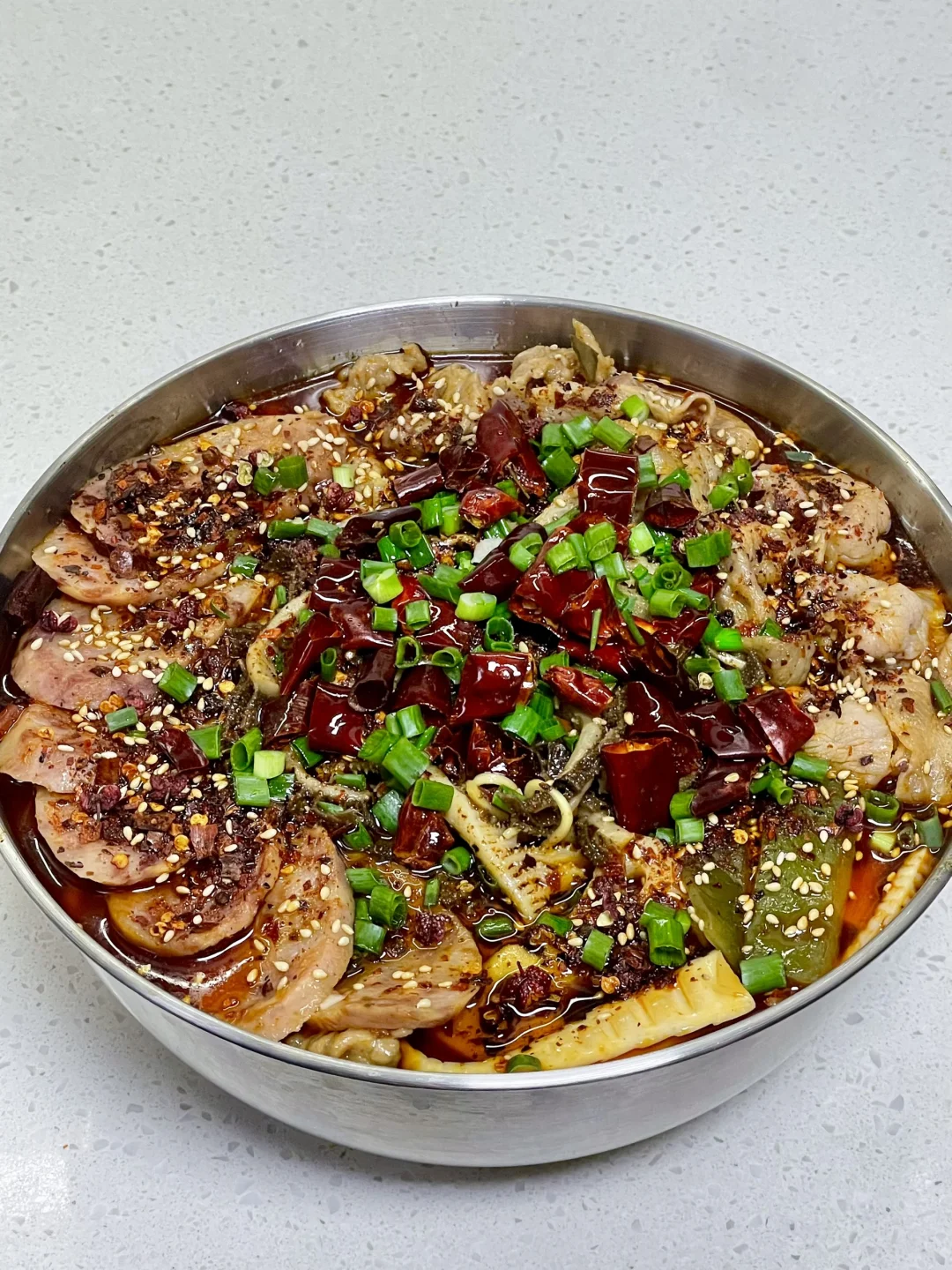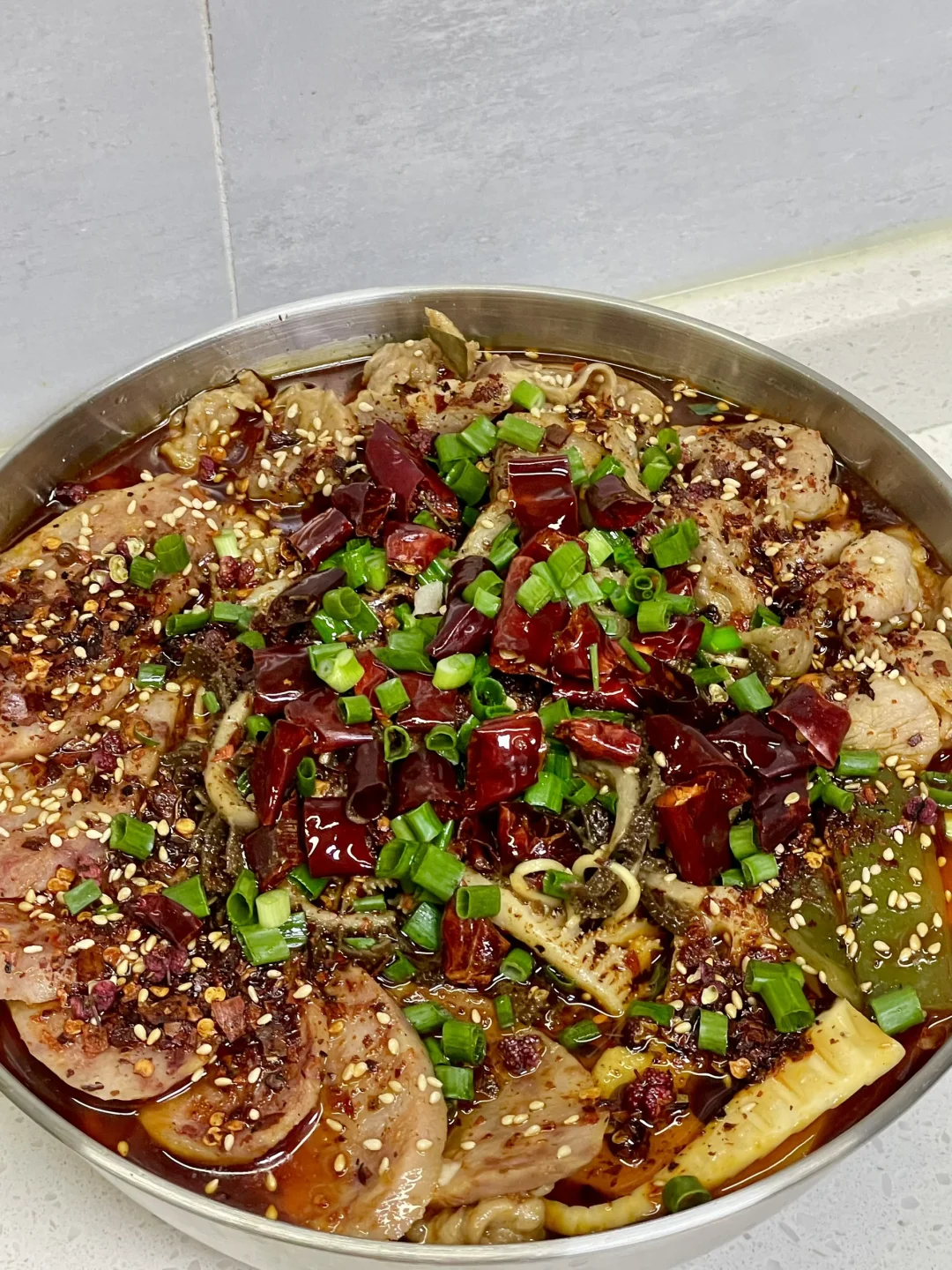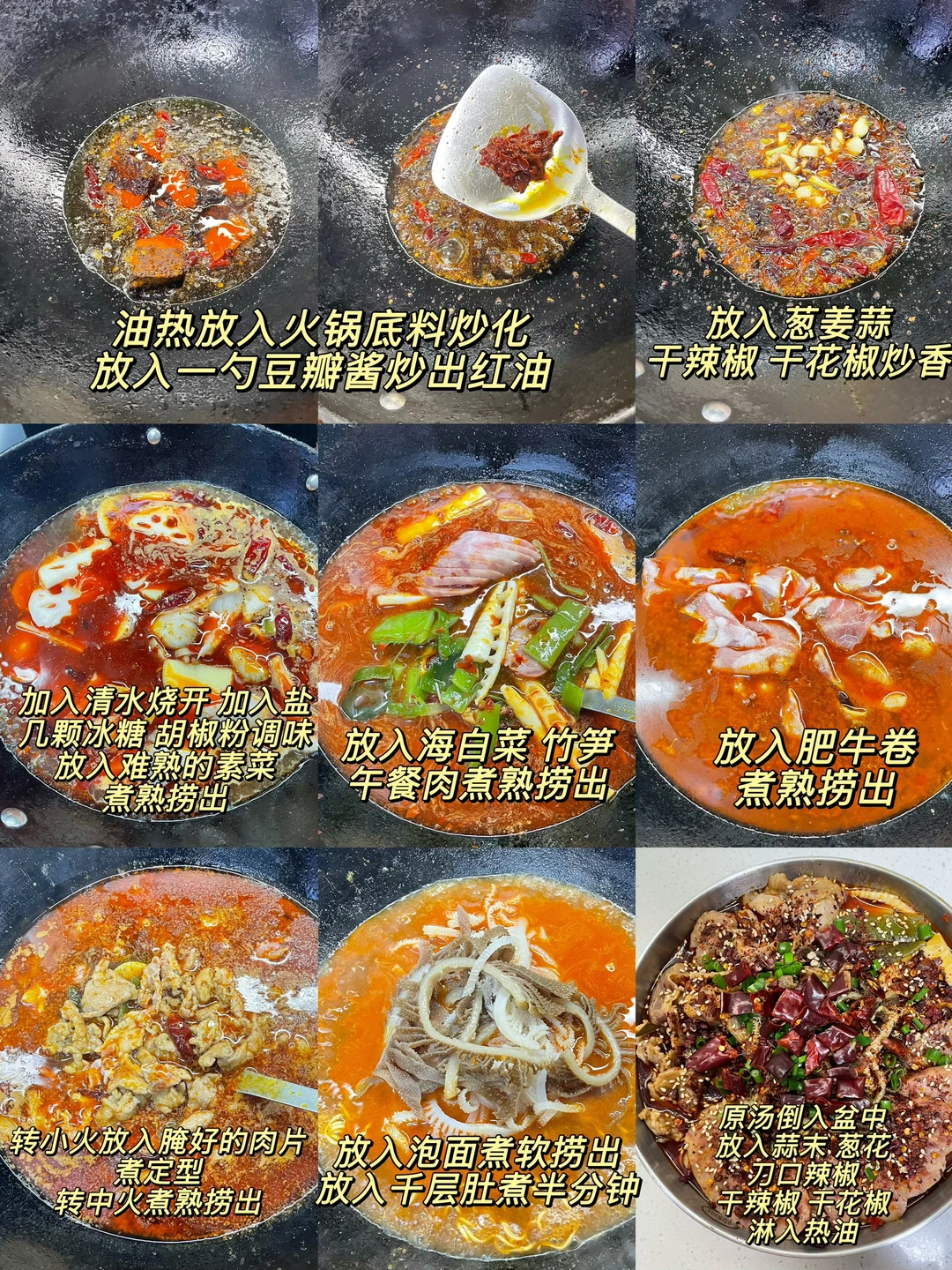 天冷了来一碗热气腾腾的冒菜,喜欢吃什么就加什么,麻辣吸汁,吃得超过瘾 1⃣️:油热倒入火锅底料炒化,加一勺豆瓣酱炒出红油,倒入干花椒 干辣椒 大蒜葱段炒香 2⃣️:加入适量清水烧开,加盐 生抽 胡椒粉和少许白糖调味,水开继续熬煮几分钟 3⃣️:放入土豆 莲藕 平菇 海白菜 笋子 火腿肠煮熟捞出,放入肥牛卷煮熟,转小火放入腌好的肉片煮定型,中火煮熟捞出捞出 4⃣️:放入泡面煮软 放入千层肚煮半分钟捞出,再倒入原汤,加入蒜末 干花椒 干辣椒段 刀口辣椒 白芝麻和葱花,淋热油激香即可