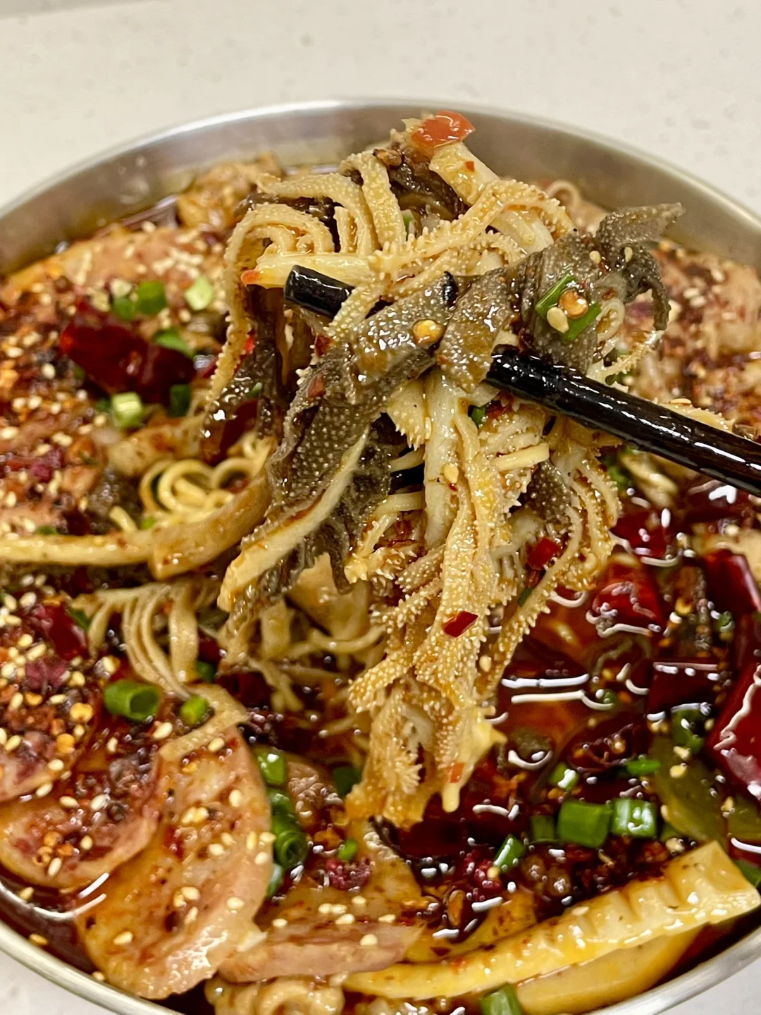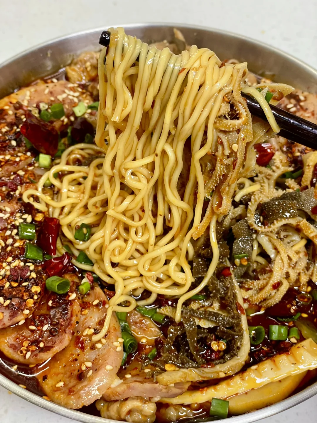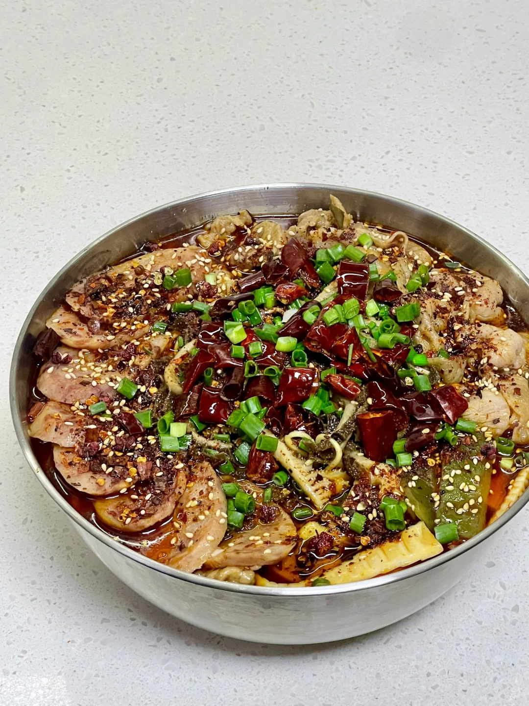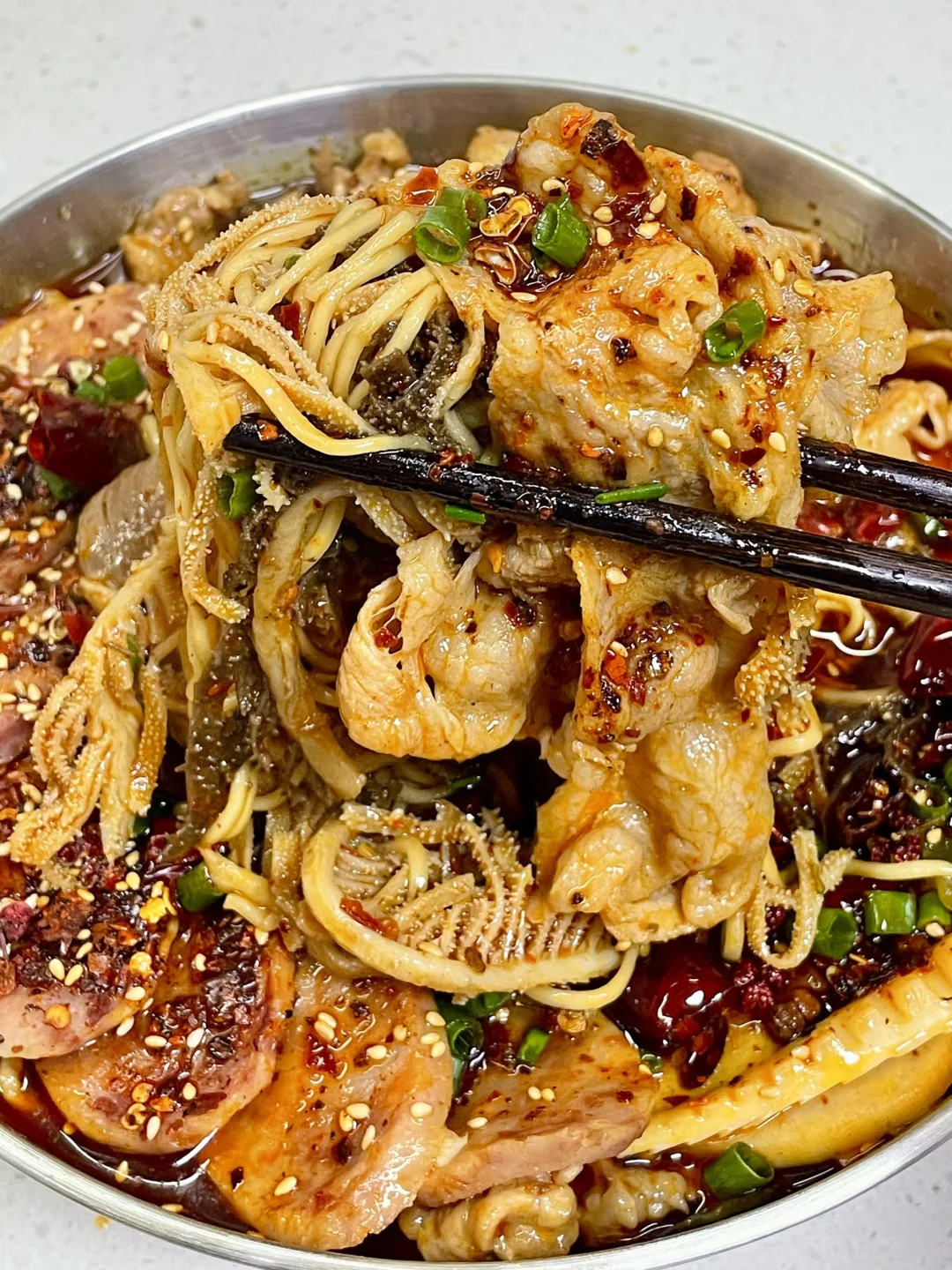 天冷了来一碗热气腾腾的冒菜,喜欢吃什么就加什么,麻辣吸汁,吃得超过瘾 1⃣️:油热倒入火锅底料炒化,加一勺豆瓣酱炒出红油,倒入干花椒 干辣椒 大蒜葱段炒香 2⃣️:加入适量清水烧开,加盐 生抽 胡椒粉和少许白糖调味,水开继续熬煮几分钟 3⃣️:放入土豆 莲藕 平菇 海白菜 笋子 火腿肠煮熟捞出,放入肥牛卷煮熟,转小火放入腌好的肉片煮定型,中火煮熟捞出捞出 4⃣️:放入泡面煮软 放入千层肚煮半分钟捞出,再倒入原汤,加入蒜末 干花椒 干辣椒段 刀口辣椒 白芝麻和葱花,淋热油激香即可