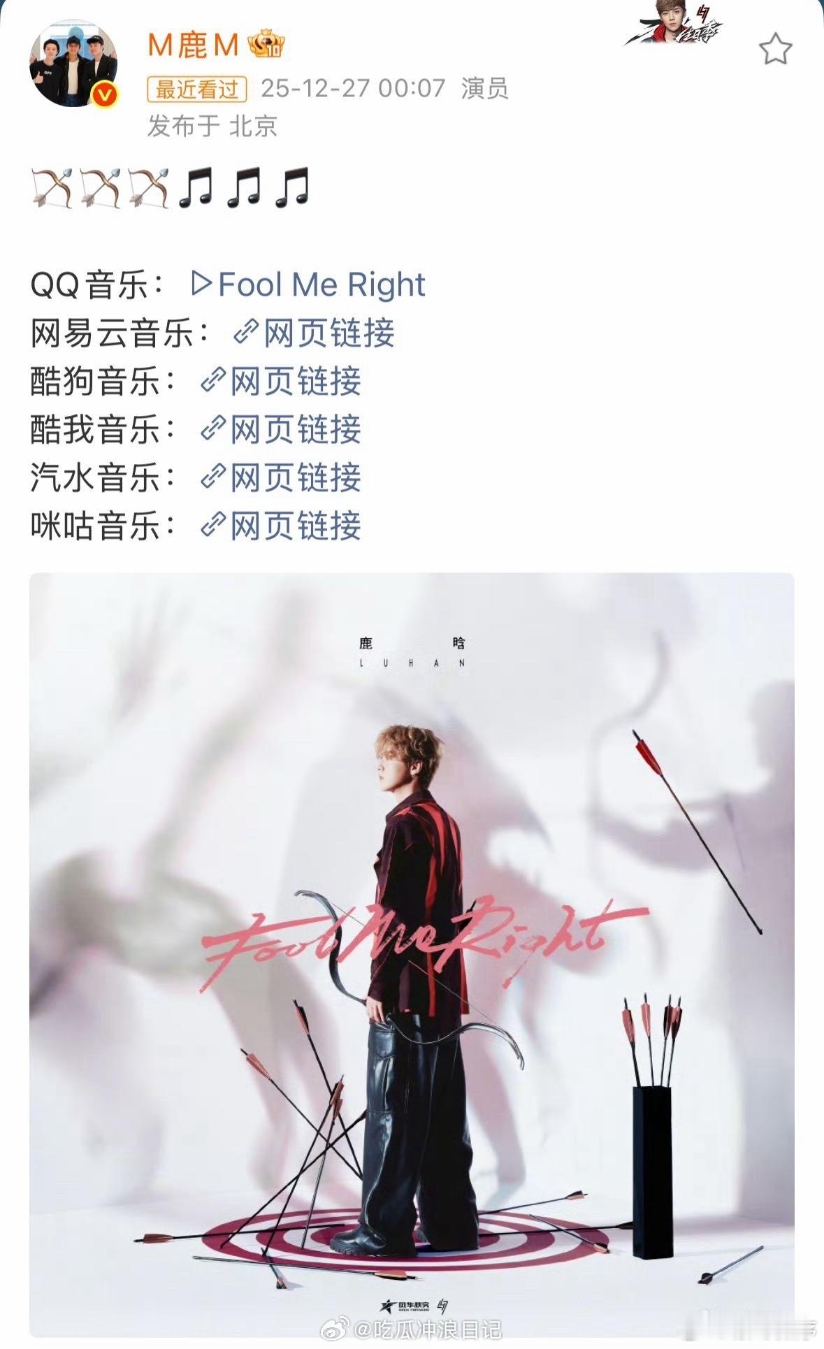 制作人鹿晗又上新了 谁能抵挡住鹿制作人的新歌!《Fool Me Right》是他的第12首作品,强劲节拍里的温柔声线,自由感直接拉满,单曲循环锁死!