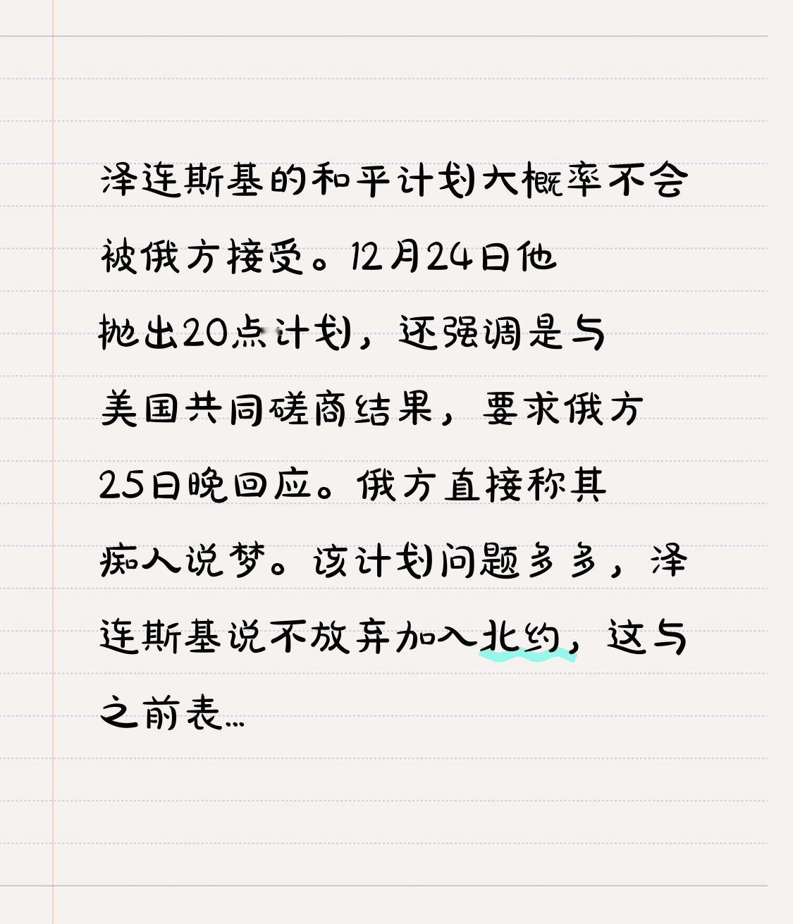 泽连斯基的和平计划大概率不会被俄方接受。12月24日他抛出20点计划,还强调是与美国共同磋商结果,要求俄方25日晚回应。俄方直接称其痴人说梦。 该计划问题多多,泽连斯基说不放弃加入北约,这与之前表态相悖,而俄乌冲突导火索就是乌方加入北约的倾向,这严重触碰俄方红线。在领土问题上,他玩文字游戏,回避顿巴斯等地归属,只提“冻结现状+国际监督”。另外,他还要求保留80万军队,要美国和北约庇护安全。这样的计划,俄方怎么可能接受。