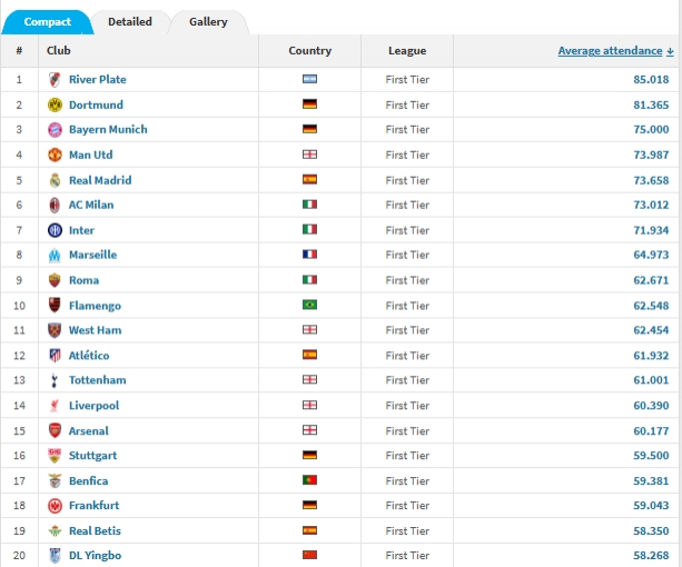 直播吧12月27日讯德转统计全球俱乐部2025年场均观众数据中,河床、多特、拜仁排在前三,中超球队大连英博排在第20位。