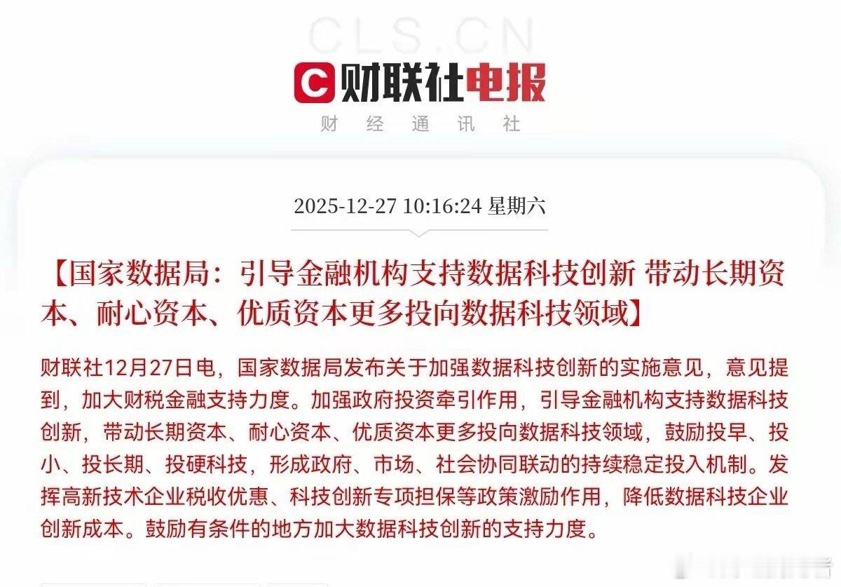 数据要素概念又要起飞了!就在刚刚!国家数据局来利好消息了…不出意外的话,下周数据要素、数据安全概念又要大爆发了,满仓这些方向的,又要乐开花了上午10点10分,国家数据局发布重磅消息,要加强关键数据技术攻关突破了,要引导金融机构支持数据科技创新,带动长期资本、耐心资本、优质资本更多投向数据科技领域,这个消息刚刚一出来,股民们高兴的都跳起来,一致认为这是大利好消息,将会点燃数据要素板块,这不仅解决了数据要素流通当前的技术瓶颈和资本顾虑,也为数据安全产业开辟了全新增长空间,在政策与市场的双重驱动下,数据要素,数据安全产业将迎来高速增长,预计到2030年市场规模有望达到万亿元,相关数据产业公司市场前景广阔,值得期待!股民们!坐稳扶好!受此重大利好消息刺激,不出意外的话,下周数据要素、数据安全、数据中心等概念又要火力全开了,相关产业头部企业有望起飞!满仓这些方向的,下周有望吃大肉了…今日看盘上证指数a股