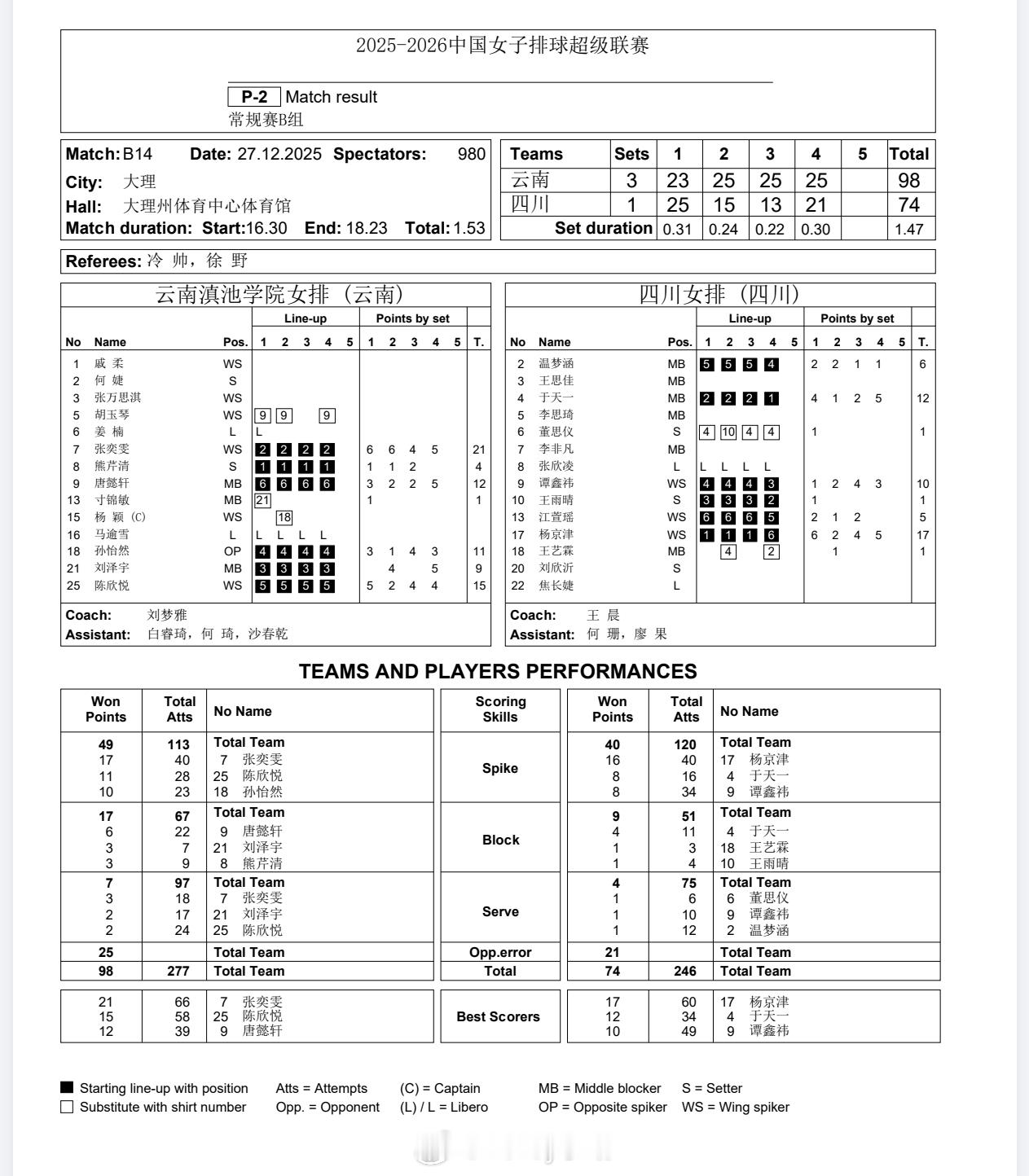 【技术统计】排超联赛第5轮,云南女排3比1四川女排(23-25 25-15 25-13 25-21)2025-2026中国排球超级联赛排超联赛