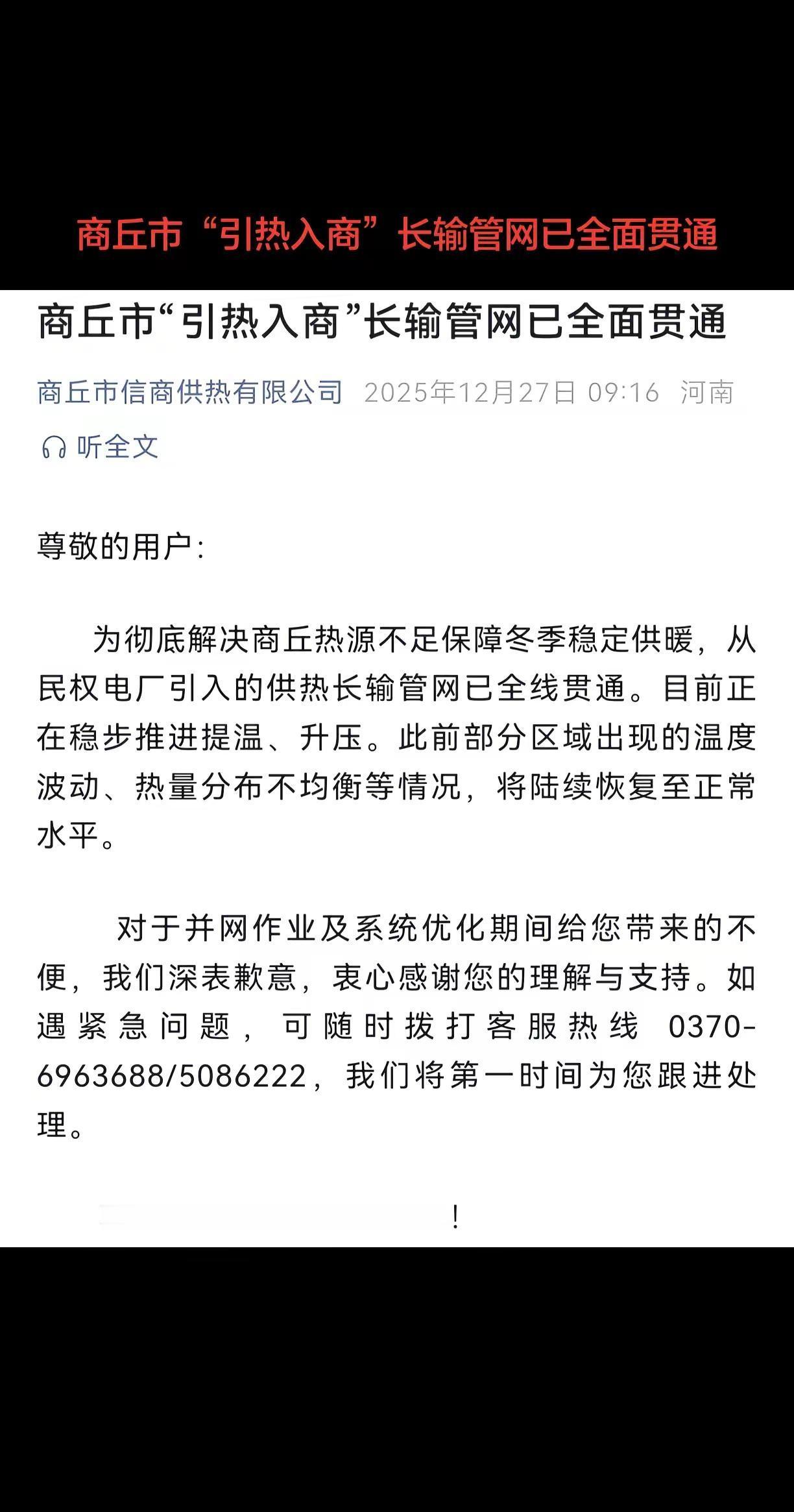商丘市“引热入商”长输管网已全面贯通。尊敬的用户:为彻底解决商丘热源不足保障冬季稳定供暖,从民权电厂引入的供热长输管网已全线贯通。目前正在稳步推进提温、升压。此前部分区域出现的温度波动、热量分布不均衡等情况,将陆续恢复至正常水平。 对于并网作业及系统优化期间给您带来的不便,我们深表歉意,衷心感谢您的理解与支持。如遇紧急问题,可随时拨打客服热线 0370-6963688/5086222,我们将第一时间为您跟进处理。 再次感谢您的耐心与包容!(来源网络)