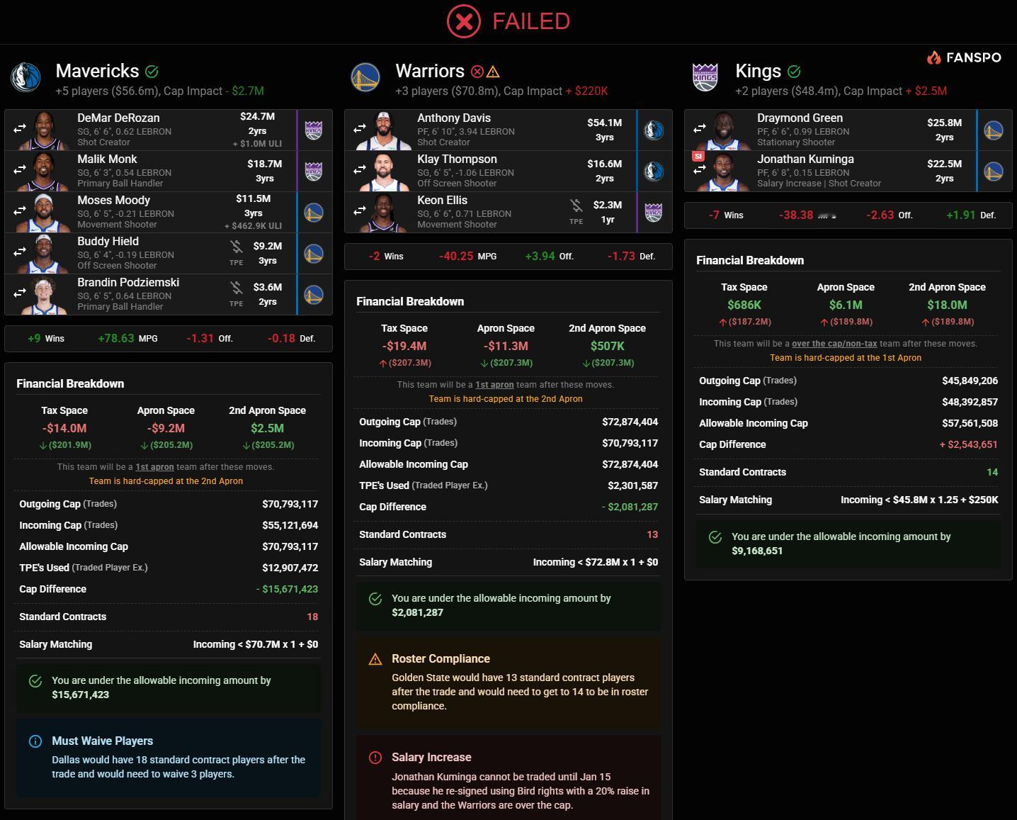 第一感觉勇士想交易戴维斯只是烟雾弹。但考虑到勇士的周期将尽,而且AD市场也有些遇冷,如果勇士没法/不想交易来字母但又打算做点什么——AD当然也不是一个应该被完全排除的选项。(而且最近隐约记得库里有怀念克莱的表达?)本着看热闹不嫌事大的原则,以此为依据攒了两笔交易,第一笔是两队直接互换,第二笔是加入了第三方球队(国王),我没把选秀权考虑进去,但反正勇士和国王都有的是选秀权......就看他们怎么衡量球员价值了。交易比较有意思的点是勇士送走了追梦,但是重新迎回了水花兄弟。而且如果是第二套方案他们将可以拥有埃利斯+水花+巴特勒+AD的组合,面对这套阵容,应该没人会舍不得追梦(以及那几个年轻人)吧?