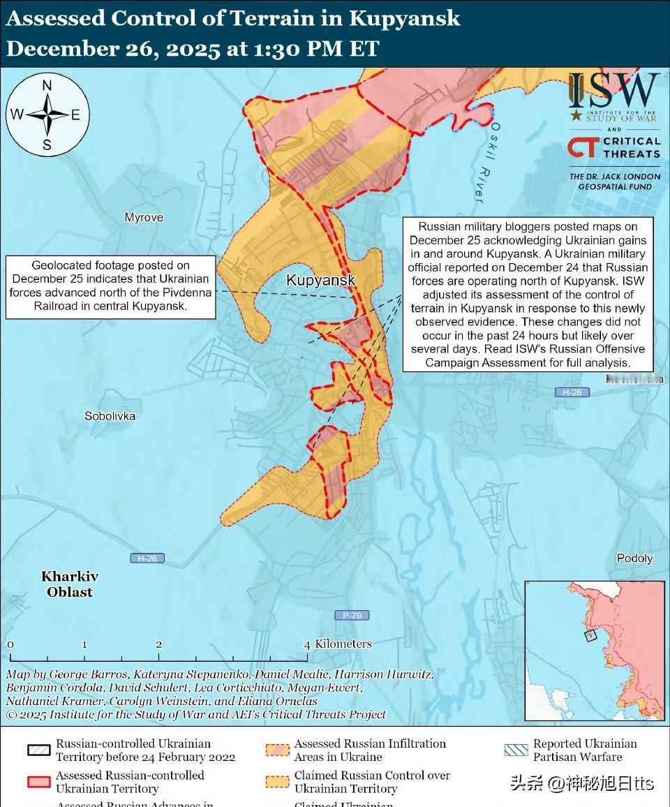 乌克兰军队在库皮扬斯克持续取得战术进展,俄罗斯军事博客作者也越来越多地承认乌克兰的胜利。 12月24日发布的带有地理位置信息的视频显示,俄军在库皮扬斯克中部对乌克兰军队发动袭击,表明乌克兰军队近期在该地区取得了进展。俄罗斯军事博客作者承认,乌克兰军队已在库皮扬斯克中部、西部、西北部和南部取得进展,其中一位军事博客作者表示,俄军并未在库皮扬斯克中部保持阵地。一位活跃于俄罗斯众筹活动的军事博客作者表示,俄军在库皮扬斯克东北部保持阵地,但乌克兰军队在其他城区活动。一位与克里姆林宫有关联的俄罗斯军事博客作者承认,乌克兰军队几乎在库皮扬斯克全境展开行动,并控制着库皮扬斯克-武兹洛维(位于库皮扬斯克南部)。俄罗斯军事博客报道称,乌克兰军队在扎帕德内附近推进,并在霍卢比夫卡东南方向(均位于库皮扬斯克以北)保持阵地。一位军事博客作者承认,俄军已失去对金德拉希夫卡、拉德基夫卡(均位于库皮扬斯克西北部)和米罗韦(位于库皮扬斯克以西)的控制。一位俄罗斯军事博客作者指出,乌克兰军队近期在库皮扬斯克东部的推进使得俄军在奥斯基尔河西岸(右岸)的处境“绝望”,因为这是俄军向右岸部队提供补给的最后通道。该军事博客作者报道称,俄军因此不得不立即放弃右岸的大部分阵地。