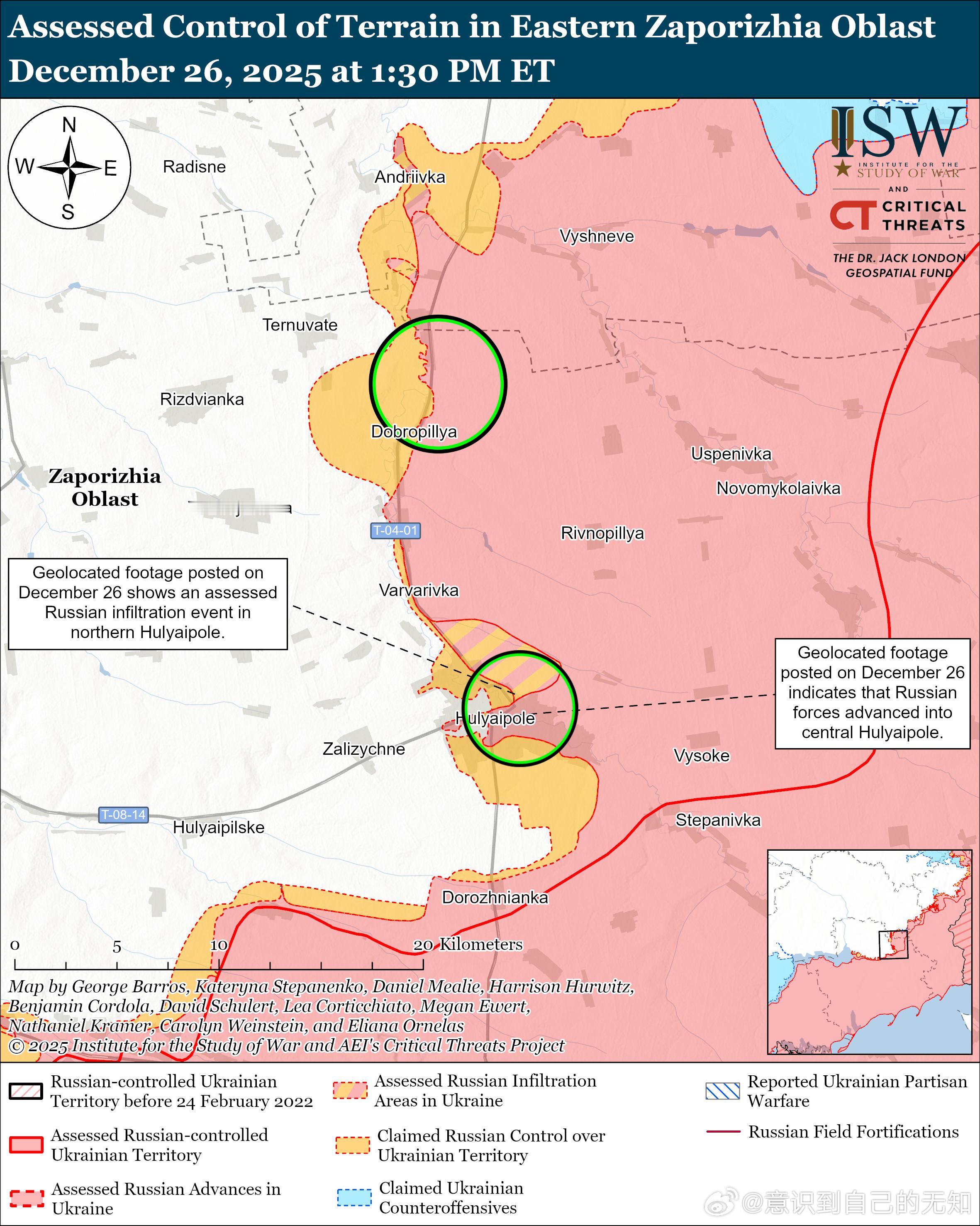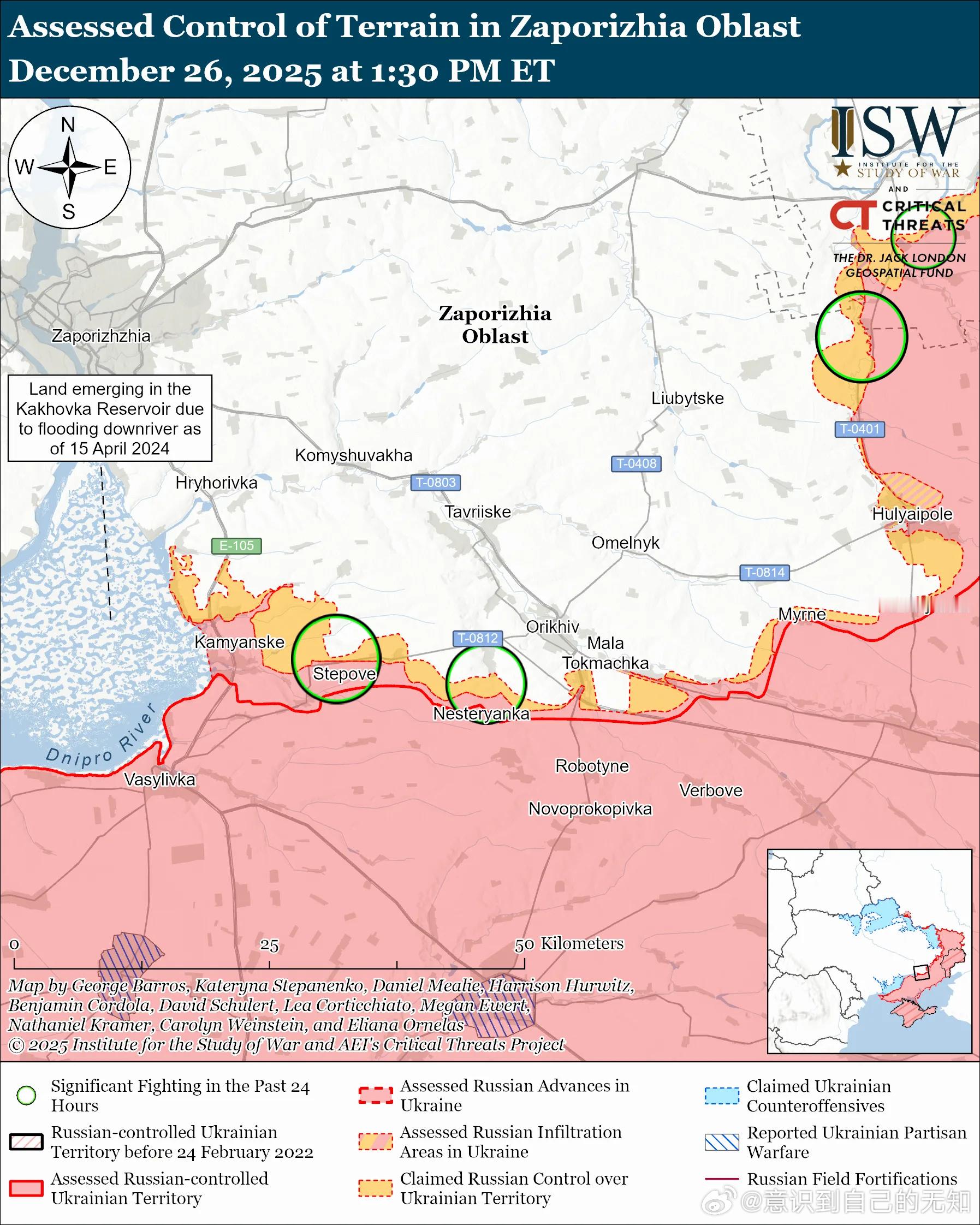南方轴心俄军目标:守住前线阵地,确保后方免受乌克兰军队袭击,并推进至扎波罗热市的火炮射程之内。俄军最近向胡利亚波列方向推进。评估俄军进展:12 月 26 日一名乌克兰军方消息人士报告称,俄军已推进至普里卢基中部(胡利亚伊波列西北部)。未经证实的说法:俄罗斯国防部于 12 月 26 日声称,俄第 37 摩步旅(第 36 合成集团军,东部军区)占领了科索夫采韦(位于胡利亚伊波列西北部)。俄罗斯军事博客作者声称,俄军占领并推进了多布罗皮利亚(位于胡利亚伊波列以北)以西的地区,并在胡利亚伊波列的西北部和南部推进。俄军攻击了胡利亚波尔附近和境内;胡利亚波尔西北方向普雷卢基、布拉茨克、特尔努瓦特和科西夫采夫; Hulyaipole以北,靠近Nove Zaporizhzhia、Varvarivka、Dobropillya和Yehorivka;在 Hulyaipole 东北部靠近 Zlahoda、Rybne、Pryvilne、Uspenivka 和 Solodke 的地方。一位俄罗斯军事博主声称,乌克兰军队从特尔努瓦特和普雷多罗日涅(胡利艾波勒西北)发起反击。乌克兰南方防卫军发言人弗拉迪斯拉夫·沃洛申上校于 12 月 24 日报告称,俄军每天对胡利亚伊波列进行 20 至 25 次 KAB 制导滑翔炸弹袭击。作战序列:俄第57摩步旅(隶属东部军区第5合成集团军)正在胡利亚伊波列中部作战。第60摩步旅(隶属第5合成集团军)正在胡利亚伊波列作战。俄罗斯总参谋部情报总局(格鲁乌)第14特种旅的无人机操作员正在沃兹德维日夫卡东南方向(胡利亚伊波列西北部)袭击乌克兰车辆。第143摩步团(隶属第5合成集团军第127摩步师)的无人机操作员正在普里卢基袭击乌克兰部队。俄罗斯空天军第11集团军(俄罗斯空天军[VKS])正在特尔努瓦特(胡利亚伊波列西北部)袭击乌克兰军队。第127摩步师第218坦克团和第5集团军第305炮兵旅的无人机操作员继续在扎波罗热州作战。俄军最近在扎波罗热州西部取得了进展。评估俄军的进展:12 月 25 日发布的地理定位视频显示,俄军向斯捷普诺戈尔斯克以南(奥里希夫以西)推进。未经证实的说法:一位俄罗斯军事博主声称,俄军向帕夫利夫卡(奥里希夫西北部)西南、斯捷普诺戈尔斯克北部、新安德里夫卡南部和普里莫尔斯克北部(均位于奥里希夫以西)推进。12月24至26日,俄军从奥里希夫西北方向的帕夫利夫卡和卢基亚尼夫斯克以及奥里希夫以西的普里莫尔斯克和斯捷普诺戈尔斯克附近发动进攻。作战序列:据报道俄第7空降师(VDV),包括其下属的第247空降团,正在普里莫尔斯克和斯捷普诺戈尔斯克附近打击乌克兰军队,并在斯捷普诺戈尔斯克境内作战。第291摩步团(隶属于第42摩步师、第58集团军、南部军区)正在新达尼利夫卡(奥里希夫以南)附近作战。第104空降师的无人机操作员正在奥里希夫附近打击乌克兰军队。第108空降团(隶属于第7空降师)继续向扎波罗热方向推进。12月25日和26日俄军继续向赫尔松方向发起进攻,但没有取得进展。12月24至26日,俄军从赫尔松市以东向安东尼夫斯基桥发动进攻。作战序列:据报道俄第98空降师的无人机操作员正在普里德尼普罗夫斯克(赫尔松市东北部)附近袭击乌克兰军队。12月24日至25日夜间,乌克兰军队继续对被占领的克里米亚境内的俄罗斯军事目标进行中程打击。乌克兰军事情报总局(GUR)于12月26日报告称,乌克兰军队于12月24日袭击了被占领的克里米亚境内的多个俄罗斯目标,包括一套S-300V防空系统、一套RSP-6M2雷达系统、一辆Redut-221指挥车、Buk-M3防空系统的RPN-9S36M火控雷达以及一处武器弹药库。
