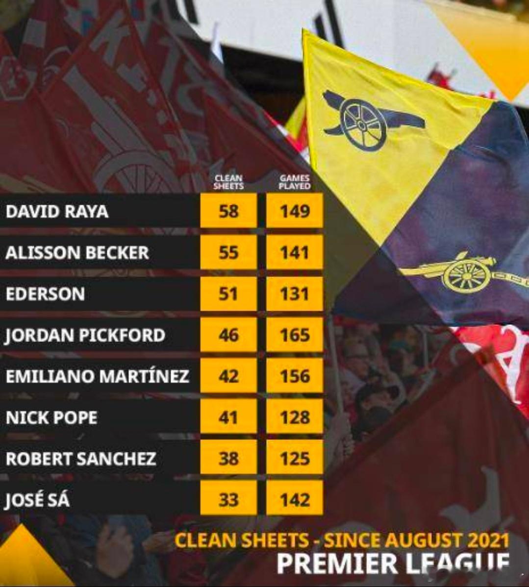 拉亚将迎来英超150场里程碑,同期零封场次最高今天晚间进行的英超第18轮比赛,阿森纳将坐镇主场迎战布莱顿。如果枪手门将拉亚出场,他将迎来自己的里程碑之战,这是拉亚的第150场英超比赛。此外,拉亚还保持着一项纪录。自从2021年8月完成英超首秀以来,拉亚已经保持了58场比赛零封对手,同期内比其他任何英超门将的零封场次都要多。数据网站统计了这一时期英超门将们的零封次数,排在拉亚之后的是利物浦的巴西国门阿利松,他在141场比赛中有过55次零封,另一位巴西国门埃德森排在第三,他在131场比赛中保持了51场零封。此后的门将分别是埃弗顿的英格兰国门皮克福德(46次)、阿斯顿维拉的阿根廷国门马丁内斯(42次)、纽卡斯尔的波普(41次)、切尔西的桑切斯(38次)和葡萄牙国门若泽·萨(33次)。