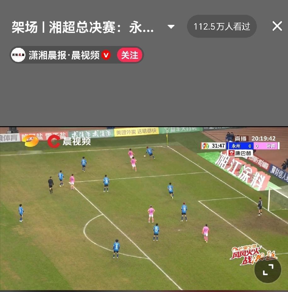 湘超决赛,正在热烈直播。常德永州之战,牵动着百万人之心。赛事进行到了第31分钟,场上比分人员是零比零,特别的焦灼。两队拼抢十分激烈,好几次都中了横梁,只要稍微低一点就破门了。永州必胜!常德加油!