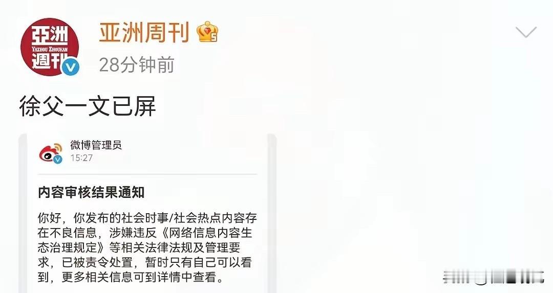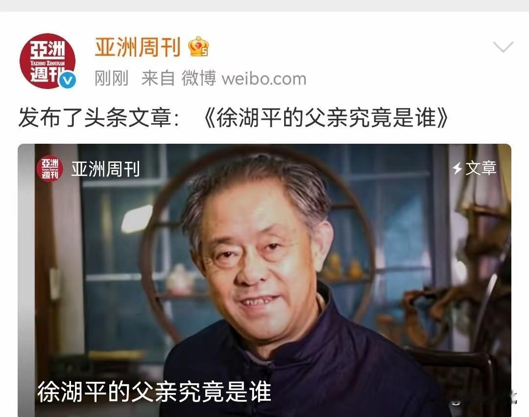 这算是踩到雷区了, 亚洲周刊发表的一篇文章被抬走了, 主要是这篇文章太敢说了,指明徐湖平的父亲究竟是谁,以前都是传闻,但亚洲周刊通过相关的证据全部串联起来,从而证明了以前的传闻不只是传闻,直接勾勒出徐湖平父亲的关系网络。 但可能因为是时机不对,又或者是根本不可能被曝光,所以只能被屏。